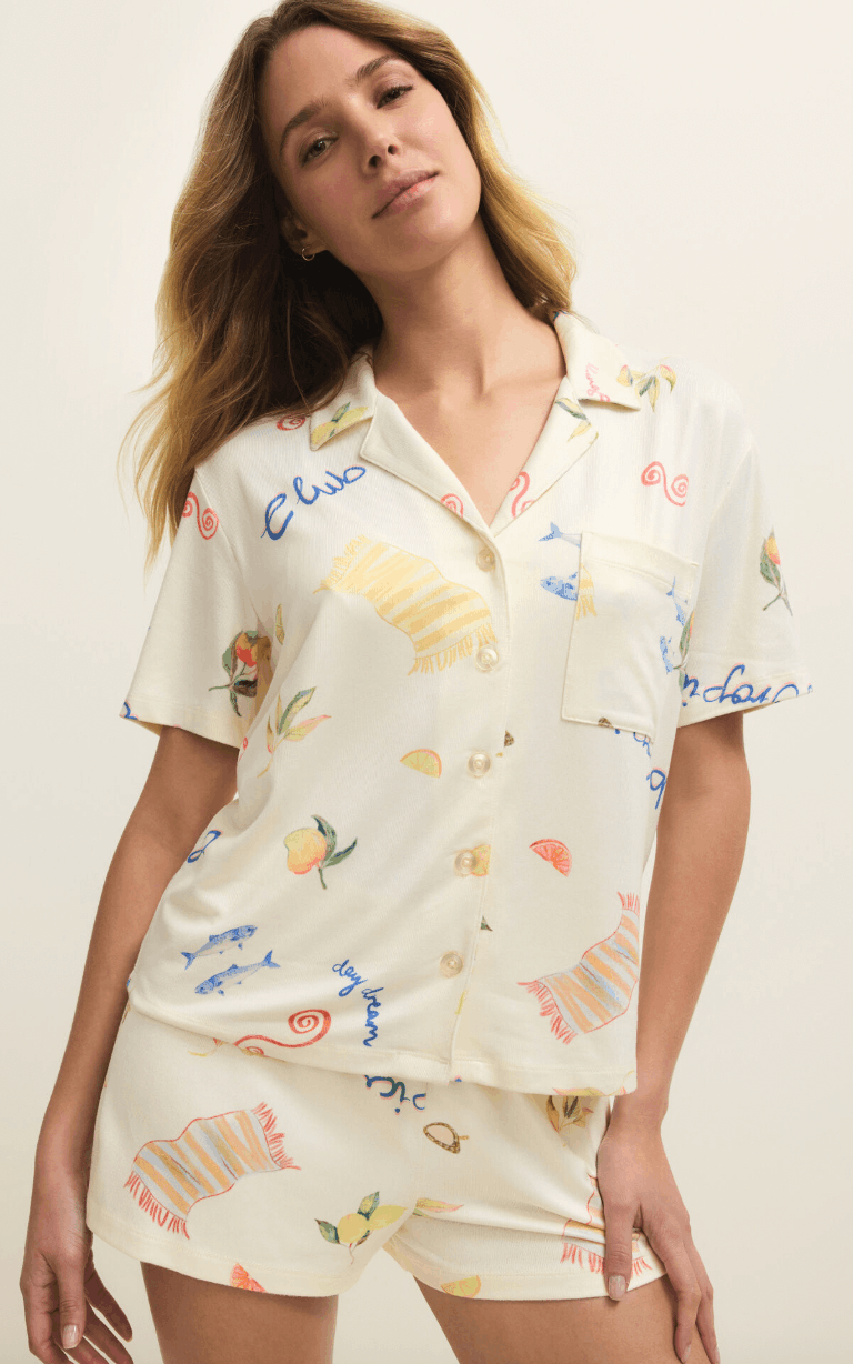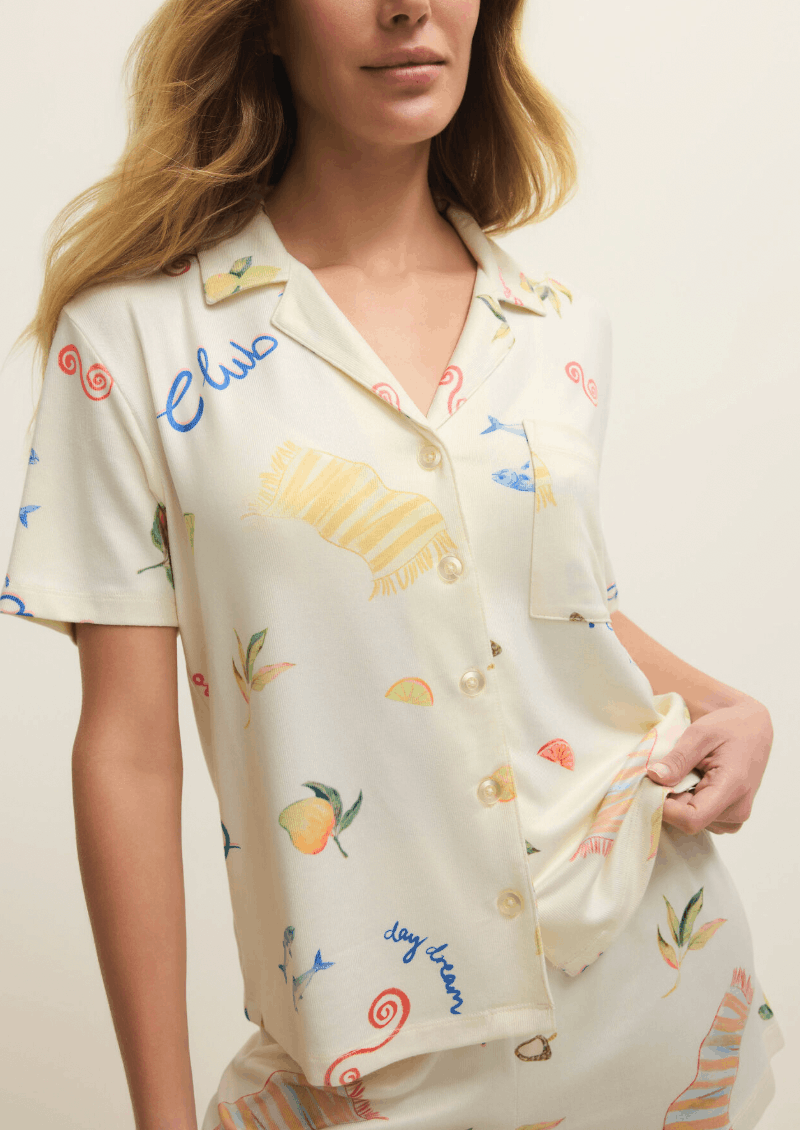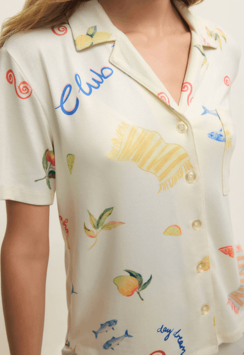 Bring the feel of a sunny getaway to your everyday routine with the Z Supply Club Tropics Button-Up Lounge Top. Designed with a relaxed, pajama-inspired silhouette, this breezy top features playful tropical graphics—think citrus fruit, beach umbrellas, and coastal icons—on a soft cream base for the ultimate vacation-ready vibe.