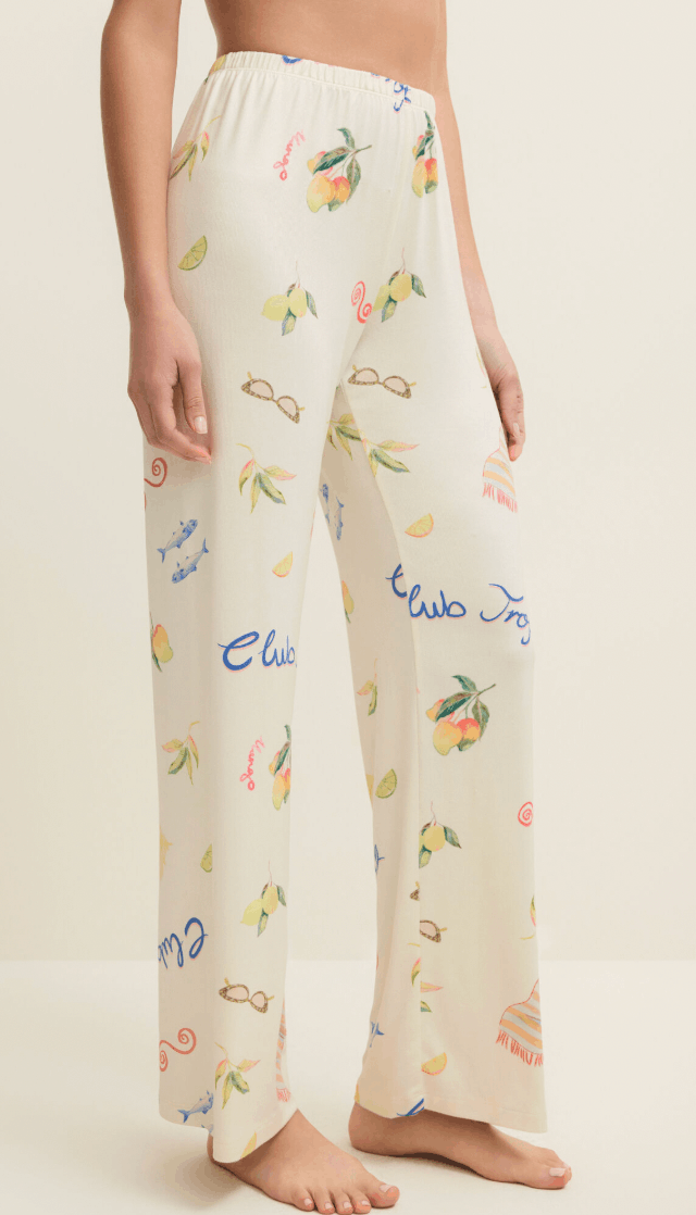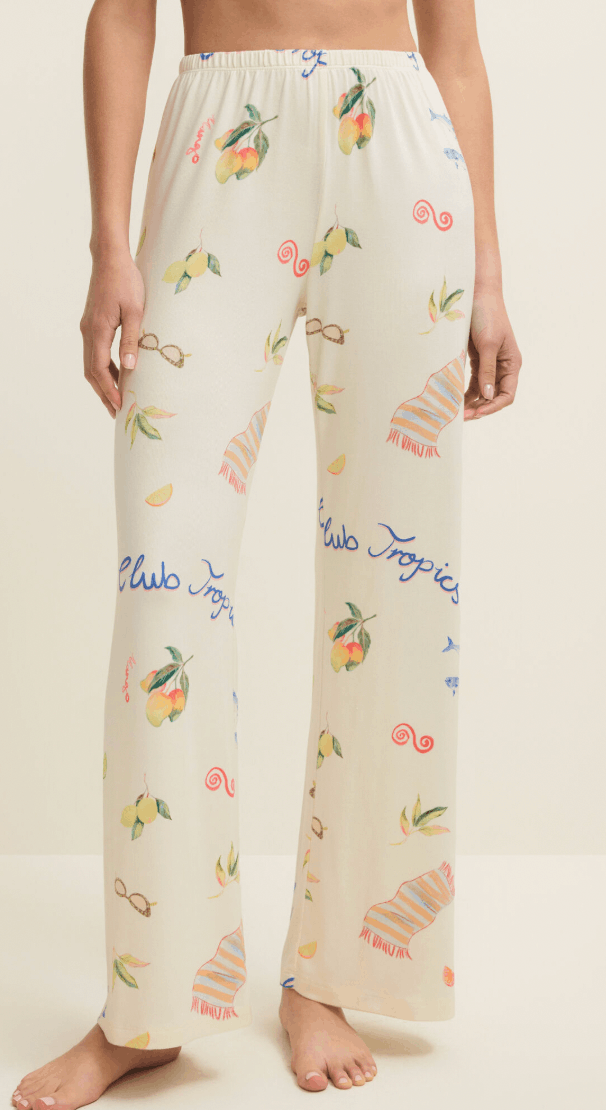 Drift into vacation mode with the Z Supply Club Tropics Lounge Pants—an easy, breezy style made for relaxed mornings and laid-back evenings. Featuring a soft cream base with playful tropical-inspired graphics like fruit, beach umbrellas, and “Club Tropics” script, these flowy pants bring sunshine energy to your lounge lineup.