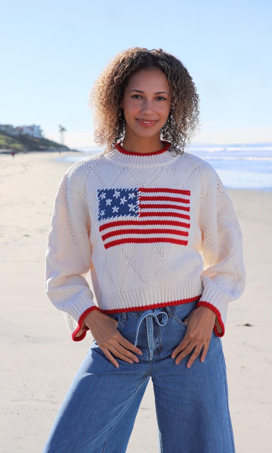 Classic Americana meets coastal cool in this playful knit sweater, featuring a sweetly stitched flag front and oversized, slouchy fit. The chunky ivory knit is trimmed in vintage red, with soft balloon sleeves and textured diamond stitching that adds depth to the laid-back silhouette. Perfect for breezy bonfire nights or holiday hangs by the coast.