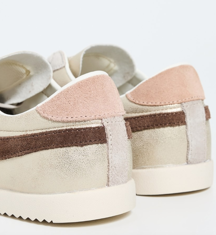 Gola ladies’ Bullet is a classic of the footwear world and it has been given a metallic update in the form of Bullet Blaze. Ladies’ Bullet Blaze features a muted gold upper, contrasting dark brown wingflash, suede heel tab and the iconic Gola branding to the side and tongue. This low-profile sleek style will add a chic and feminine edge to any outfit.