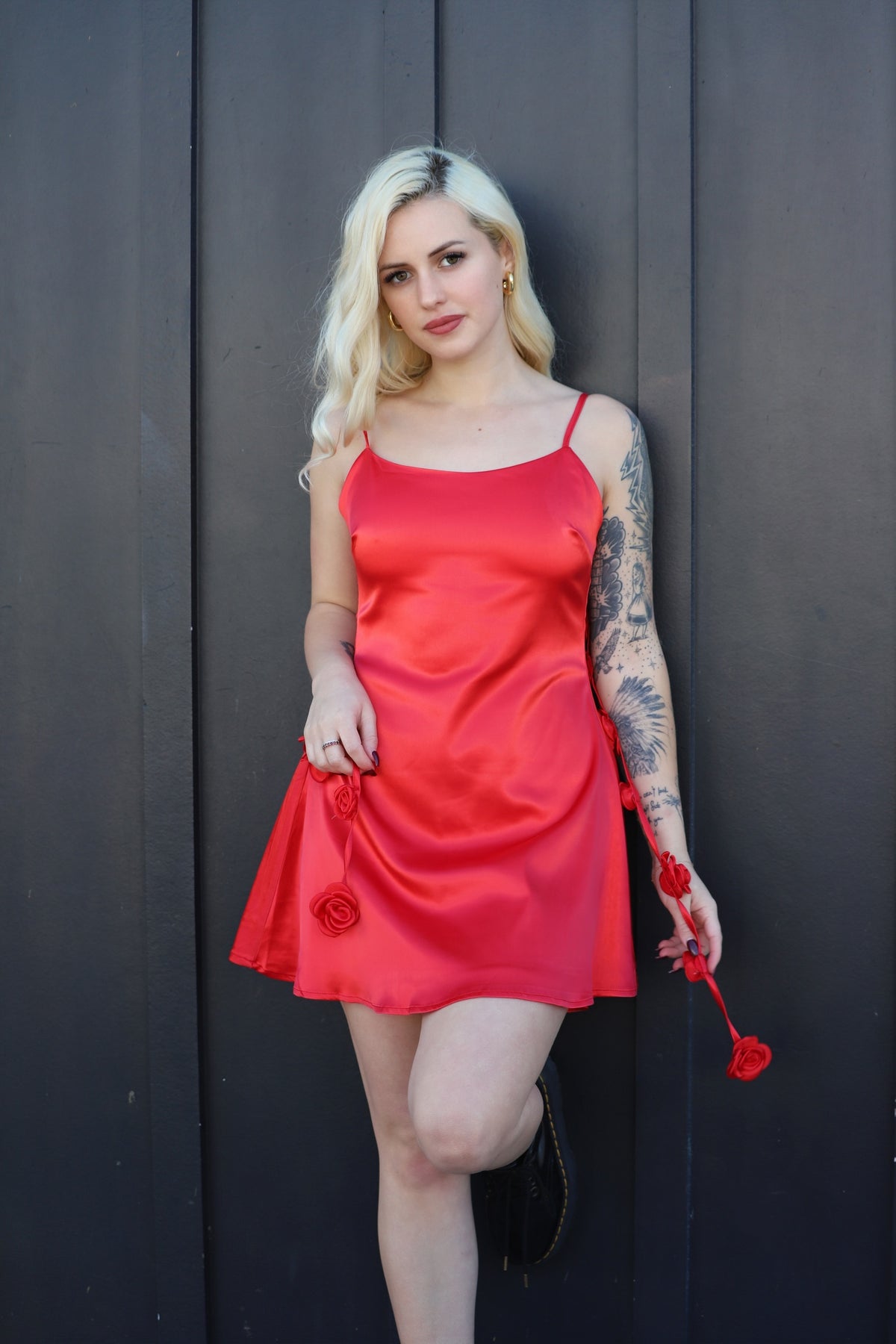 From the luxe satin feel to the dreamy rose details, this dress is pure poetry in motion. Feminine, bold, and oh-so-special.