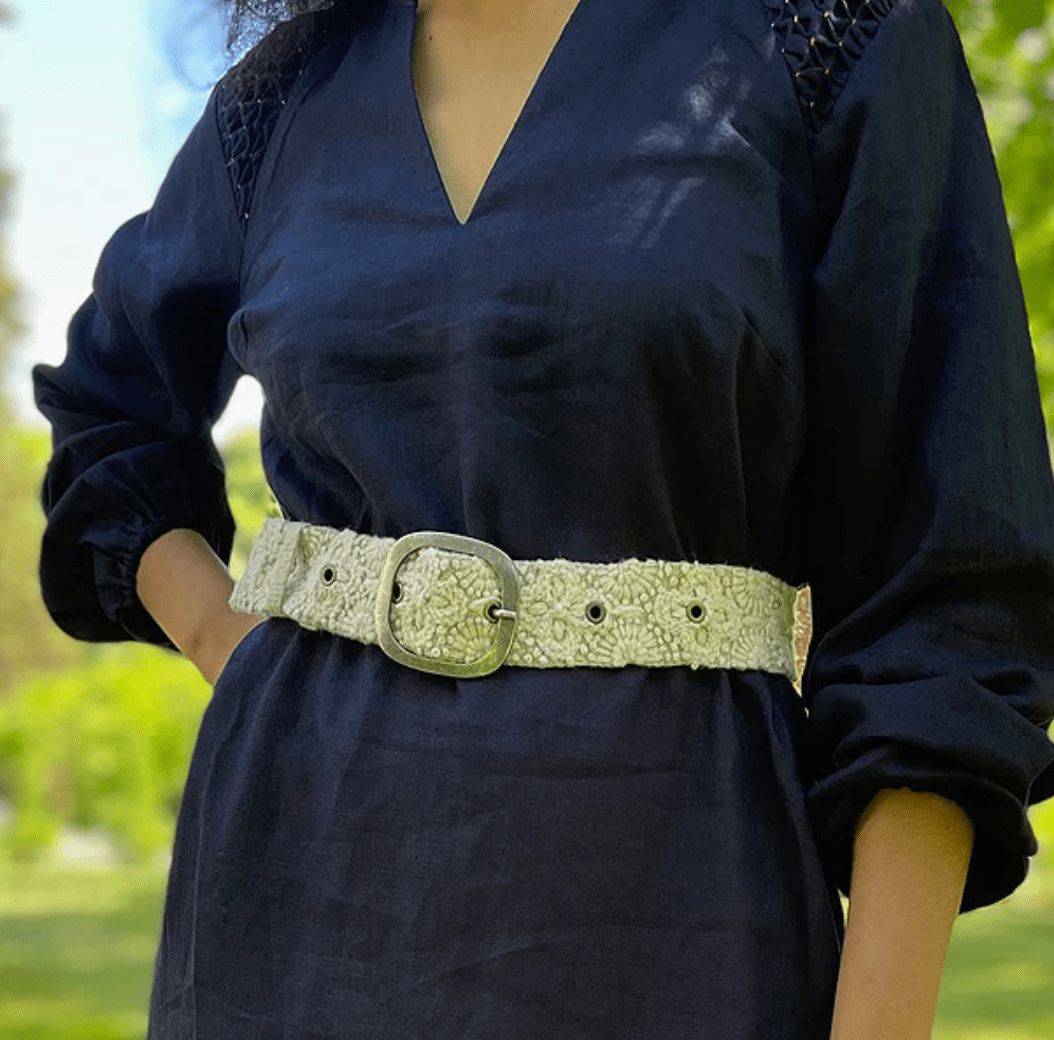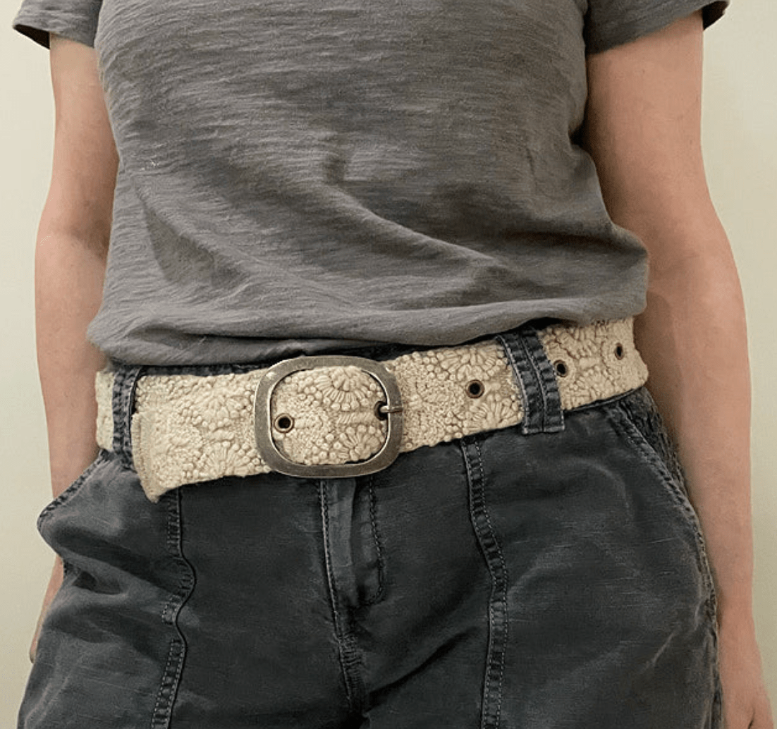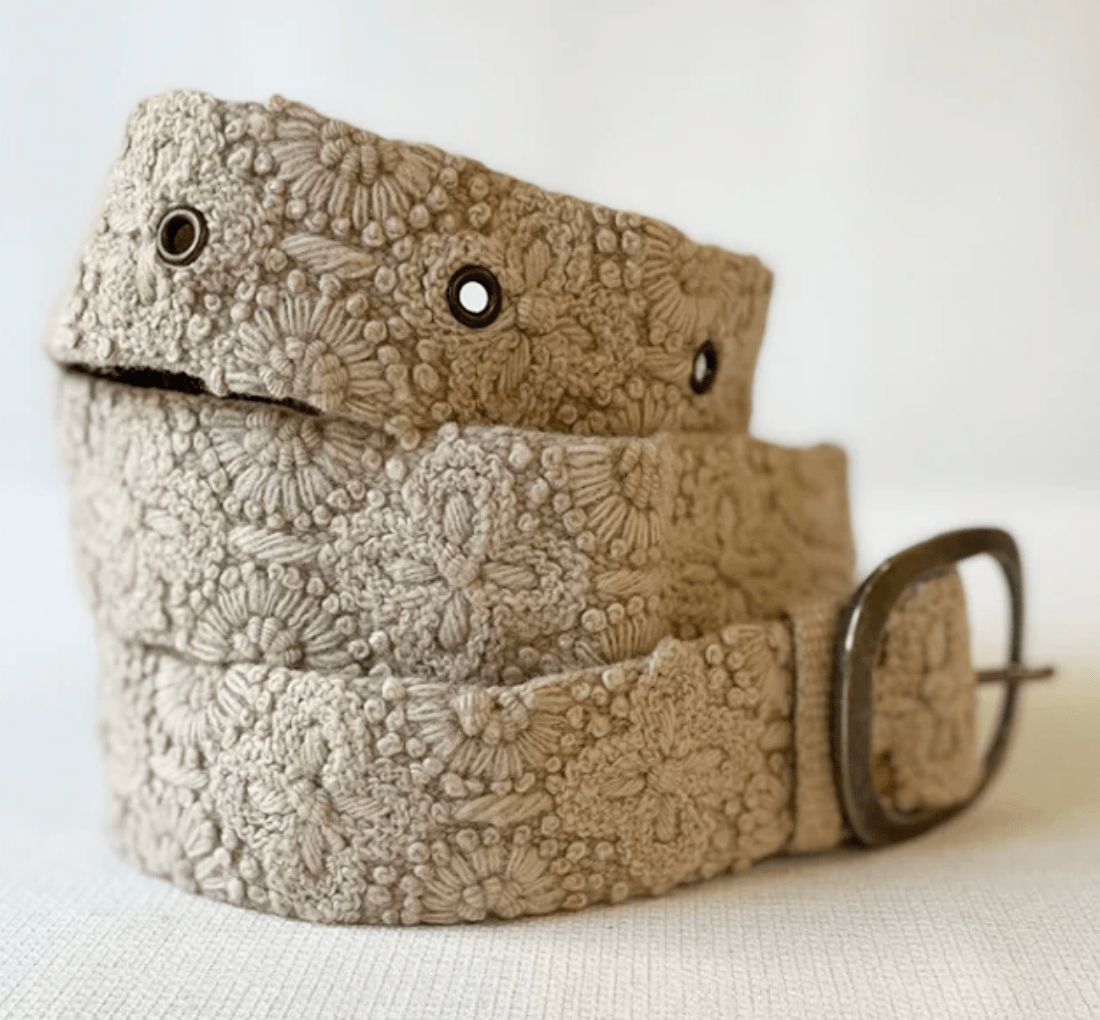 Gorgeous embroidered belt designed to be versatile with 5 sets of holes 2" apart so it can be worn at the hip or at the waist. You will love the slight stretch that conforms to the body after a few days of wear - just like your favorite pair of jeans!