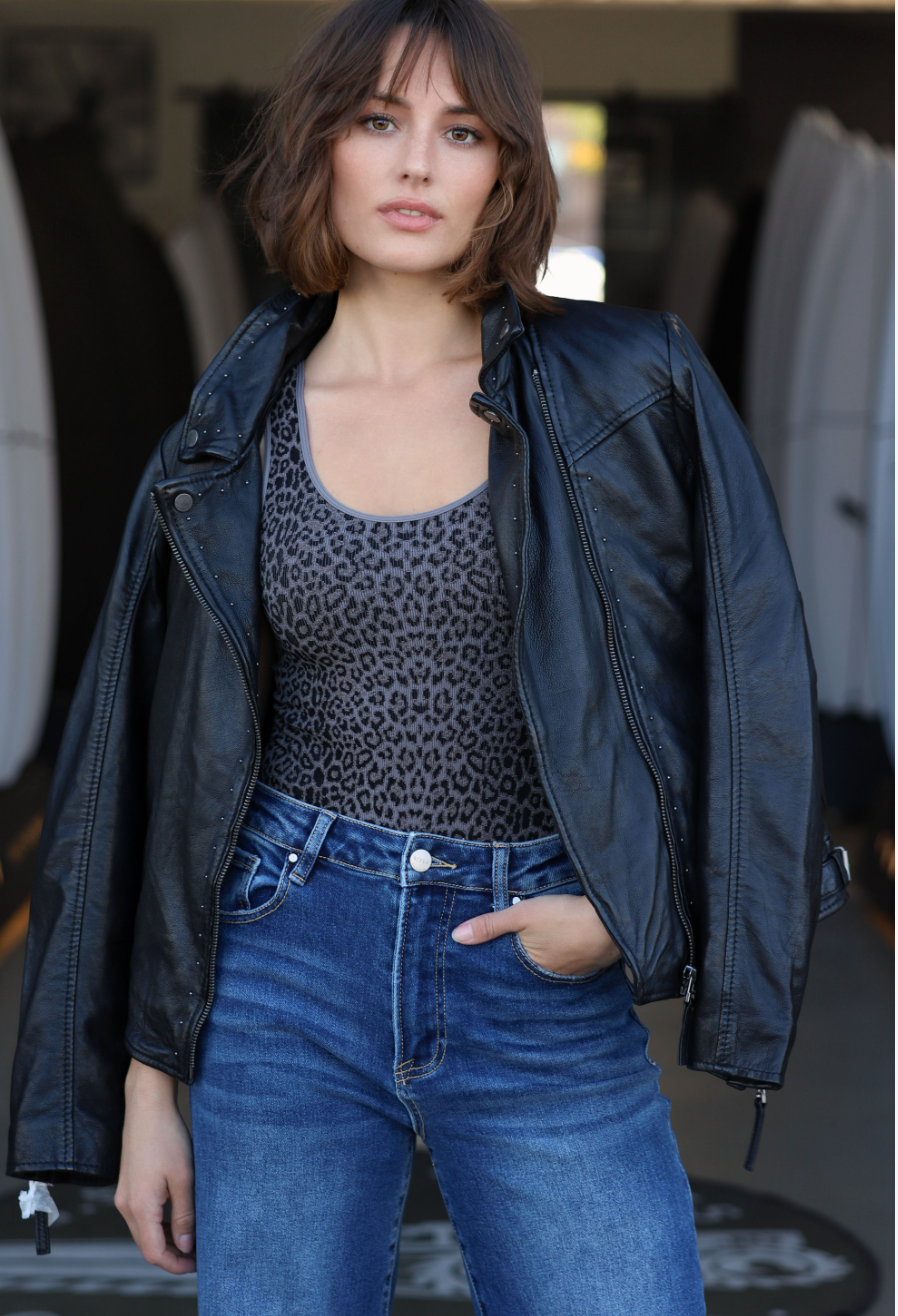 Unleash your inner cool girl with the Wild Instinct Leopard Bodysuit. Made for layering or standing out solo, this scoop neck silhouette hugs in all the right places and serves up that fierce, no-fuss confidence. With a soft, stretchy feel and neutral-toned animal print, it’s an easy go-to for edgy nights out or laid-back daytime looks.