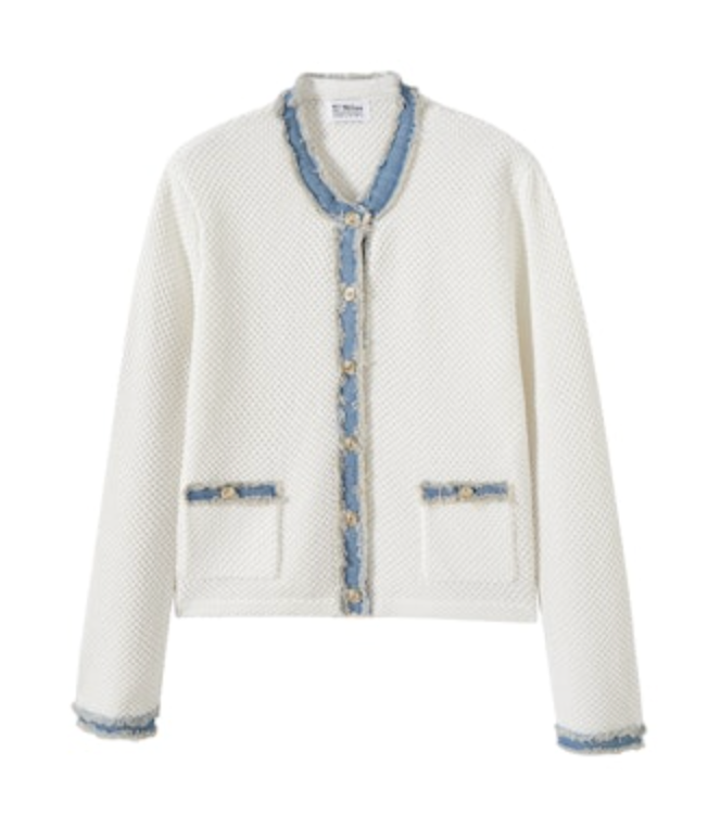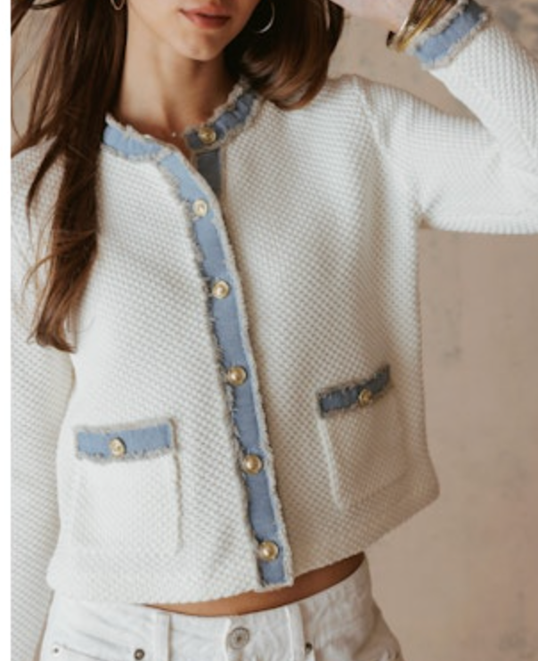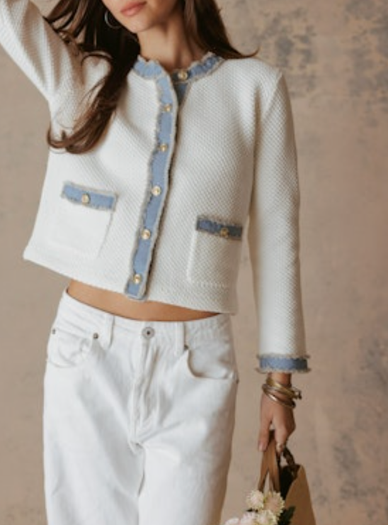 Meet the cardigan that blends timeless tailoring with modern coastal charm. Our Button Up Crew Neck Cardigan with Denim Detailing features a soft ivory textured knit elevated by contrast blue denim trim along the neckline, placket, pockets, and cuffs. Finished with statement gold-tone buttons and subtle frayed edges, this piece gives classic sophistication a relaxed, Southern California edge.