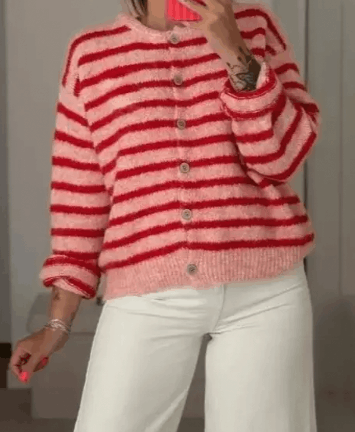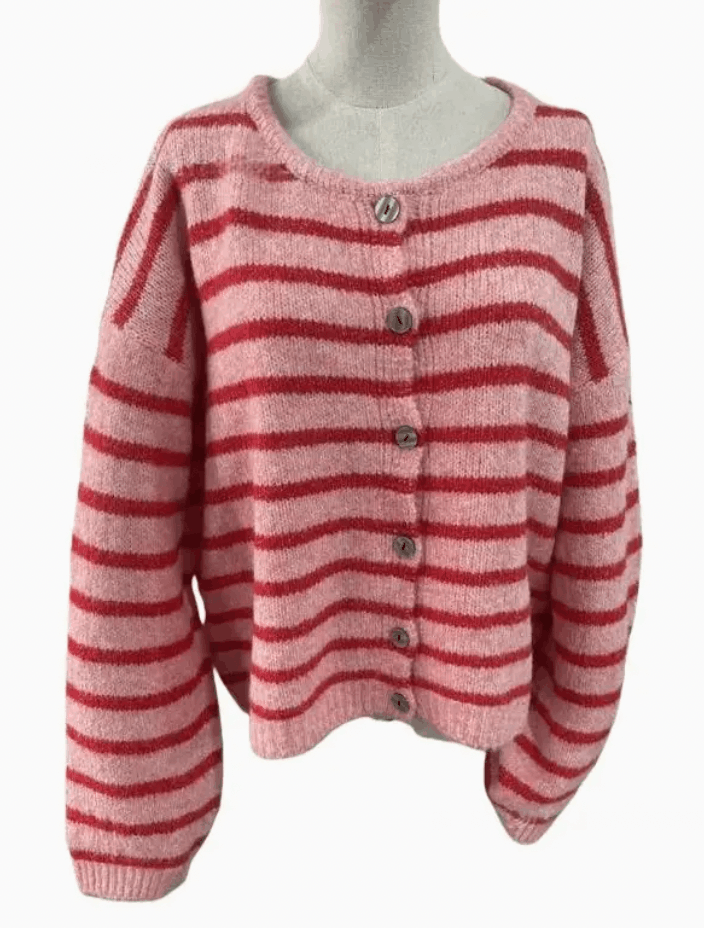 CardiMeet your new crush-worthy layer: the Valentine’s Crew Neck Cardigan is soft, stripey, and full of charm. With candy-inspired shades of blush and cherry red, this button-up cardi brings playful romance to any outfit. Its fuzzy texture and easy fit make it perfect for everything from coffee dates to coastal walks. Sweet with denim, dreamy over dresses—it’s basically love at first wear.