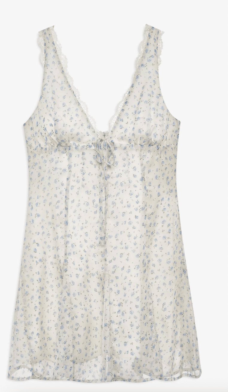 Clean and feminine, this sleeveless floral mini dress features lace trim, subtle bodice boning, and a fluted skirt for a spring mini dress that embodies coastal ease.