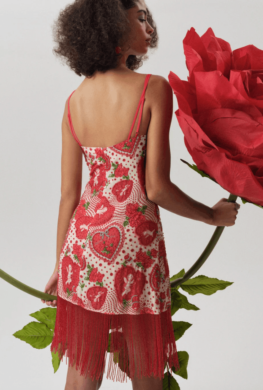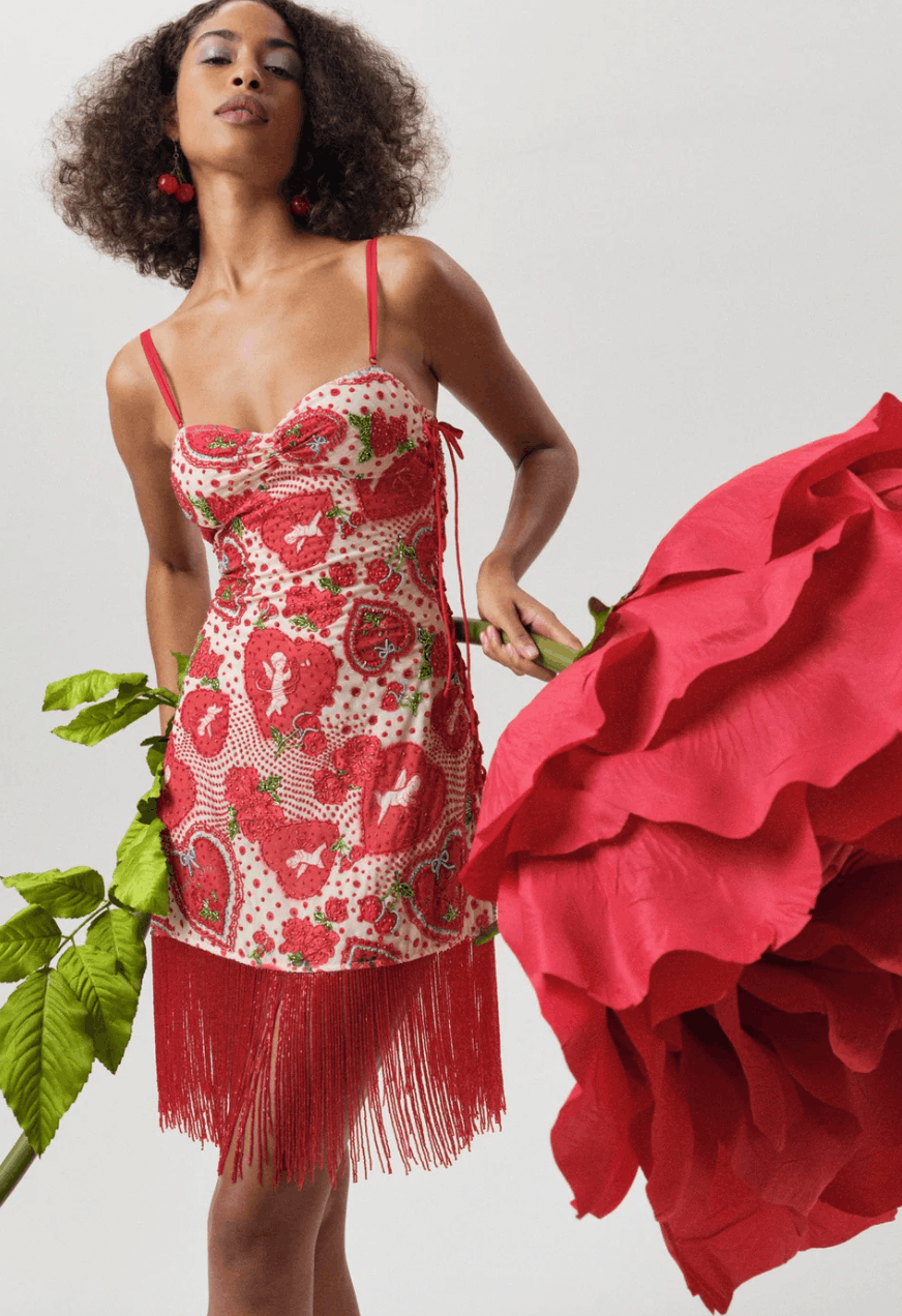 This Valentine’s Day mini dress, with its pop-art cupid polka-dot print, sweetheart ruched neckline, and flirty fringe detail, is the perfect party dress for dressed-up drinks and romantic dinners.
