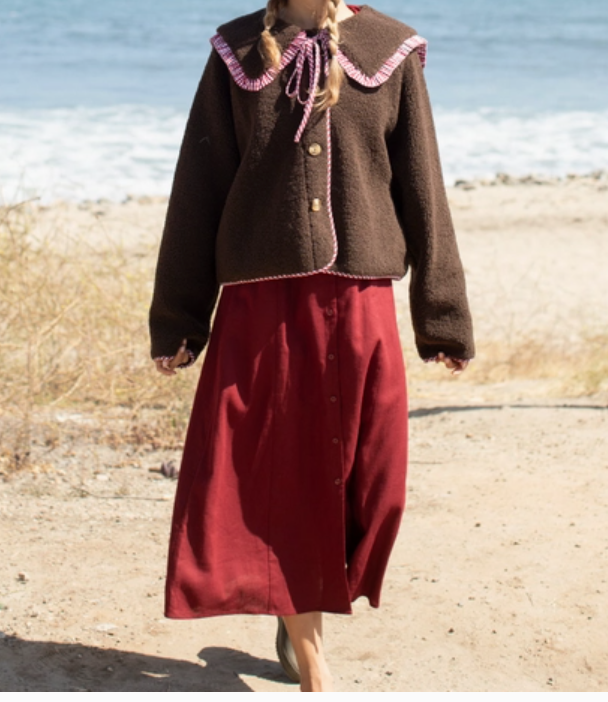 Sweet with a playful twist, the Cocoa Picnic Sherpa Jacket is a cozy layering piece that gives major storybook energy. Made with plush teddy fleece and finished with an oversized Peter Pan collar trimmed in red gingham, this jacket is perfect for seaside strolls, pumpkin patches, or just curling up at your favorite San Clemente café.