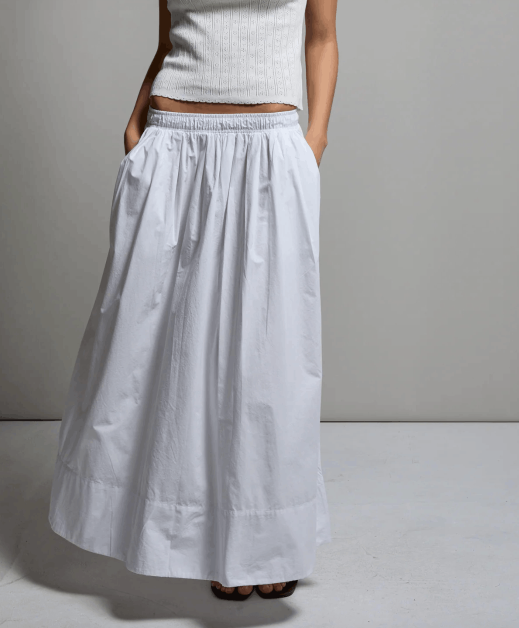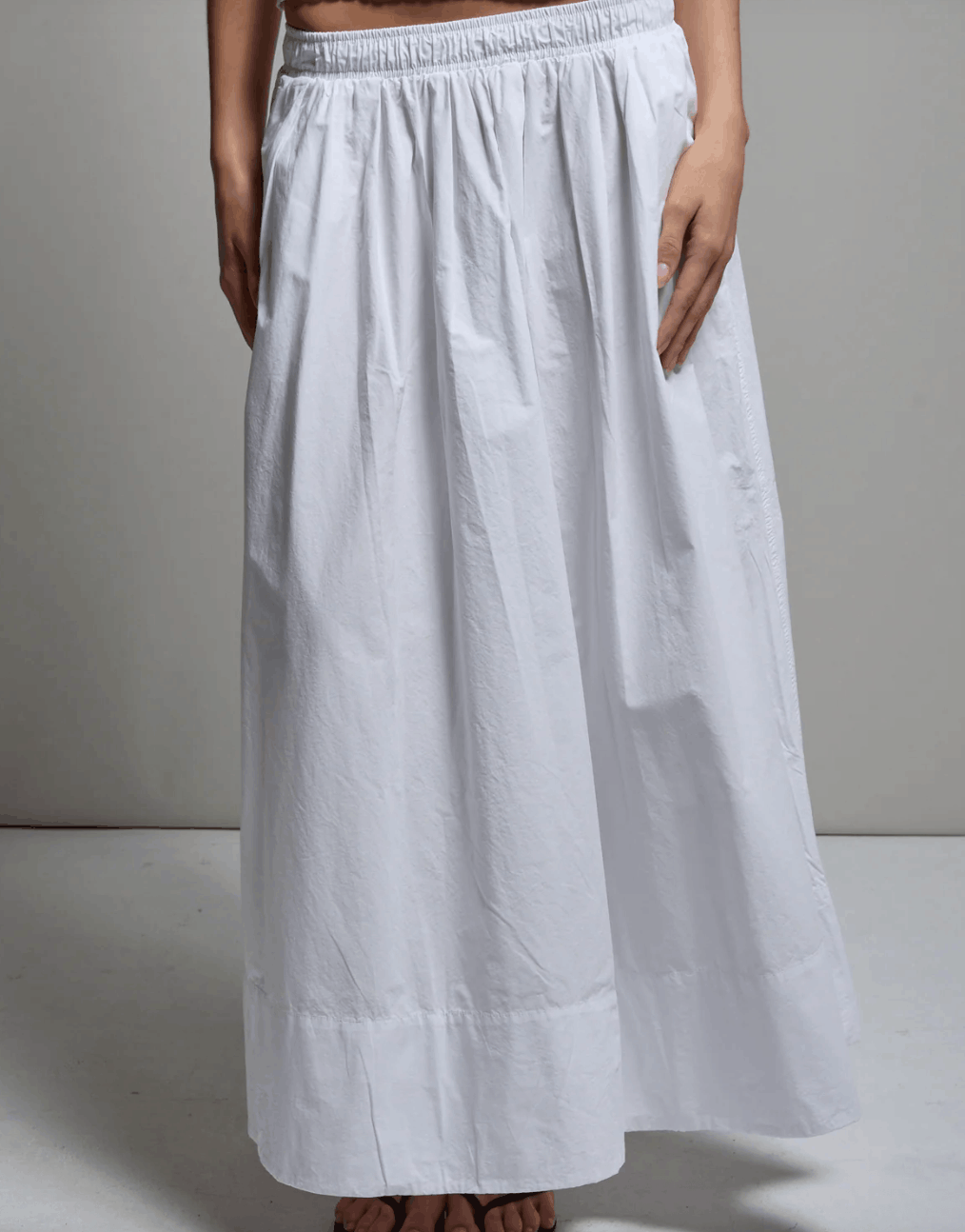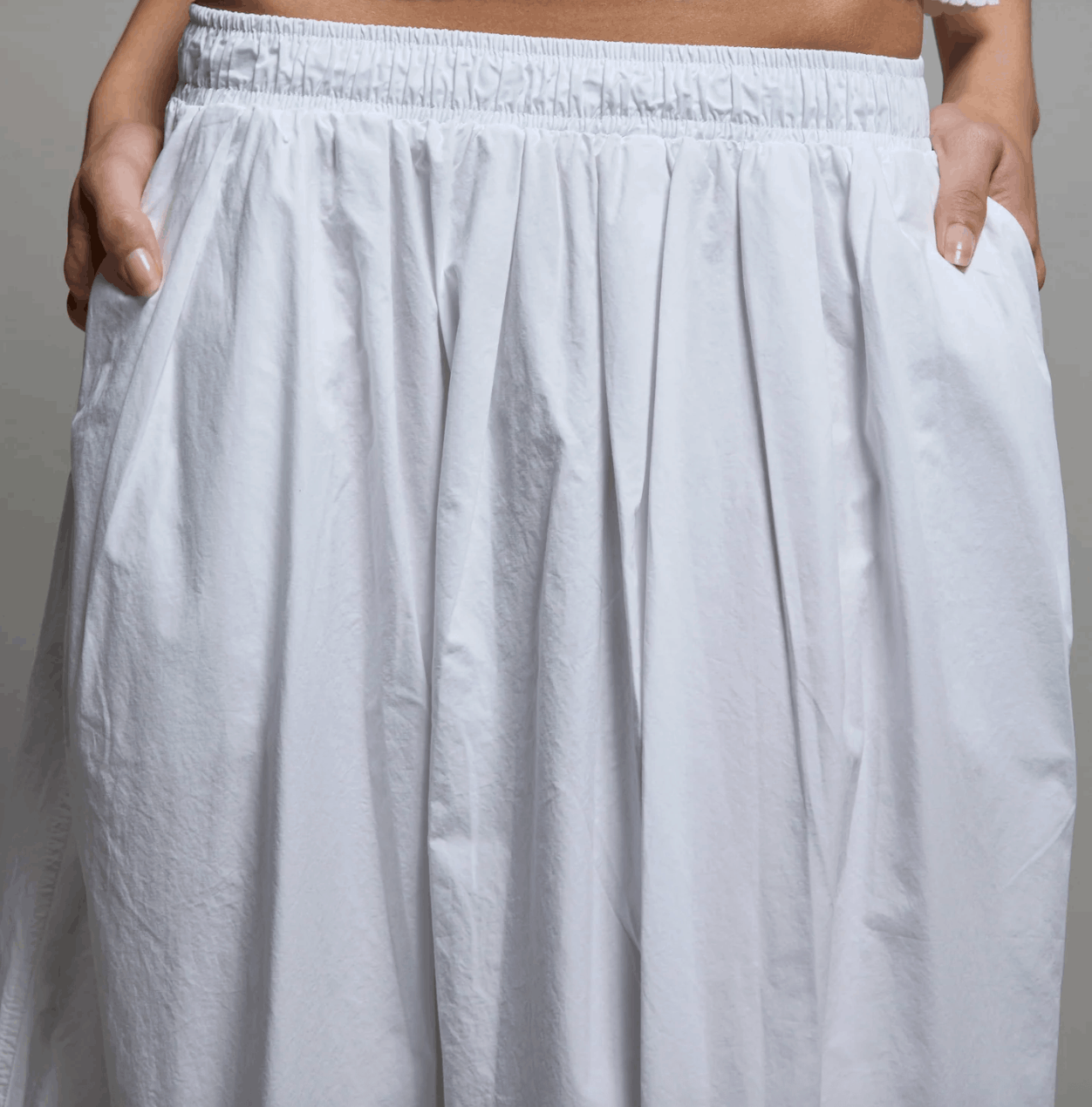 The Kate Skirt is a standout favorite—bold, refined, and unapologetically dramatic. With its exaggerated volume and cinched, multi-needle waistband, it brings a sense of modern romance to everyday dressing. Crafted from structured yet breathable cotton poplin, it moves with a crisp swish and holds its shape beautifully. Thoughtful details like tailored front pleats, discreet side-seam pockets, and a wide-faced hem complete the look with a polished finish.