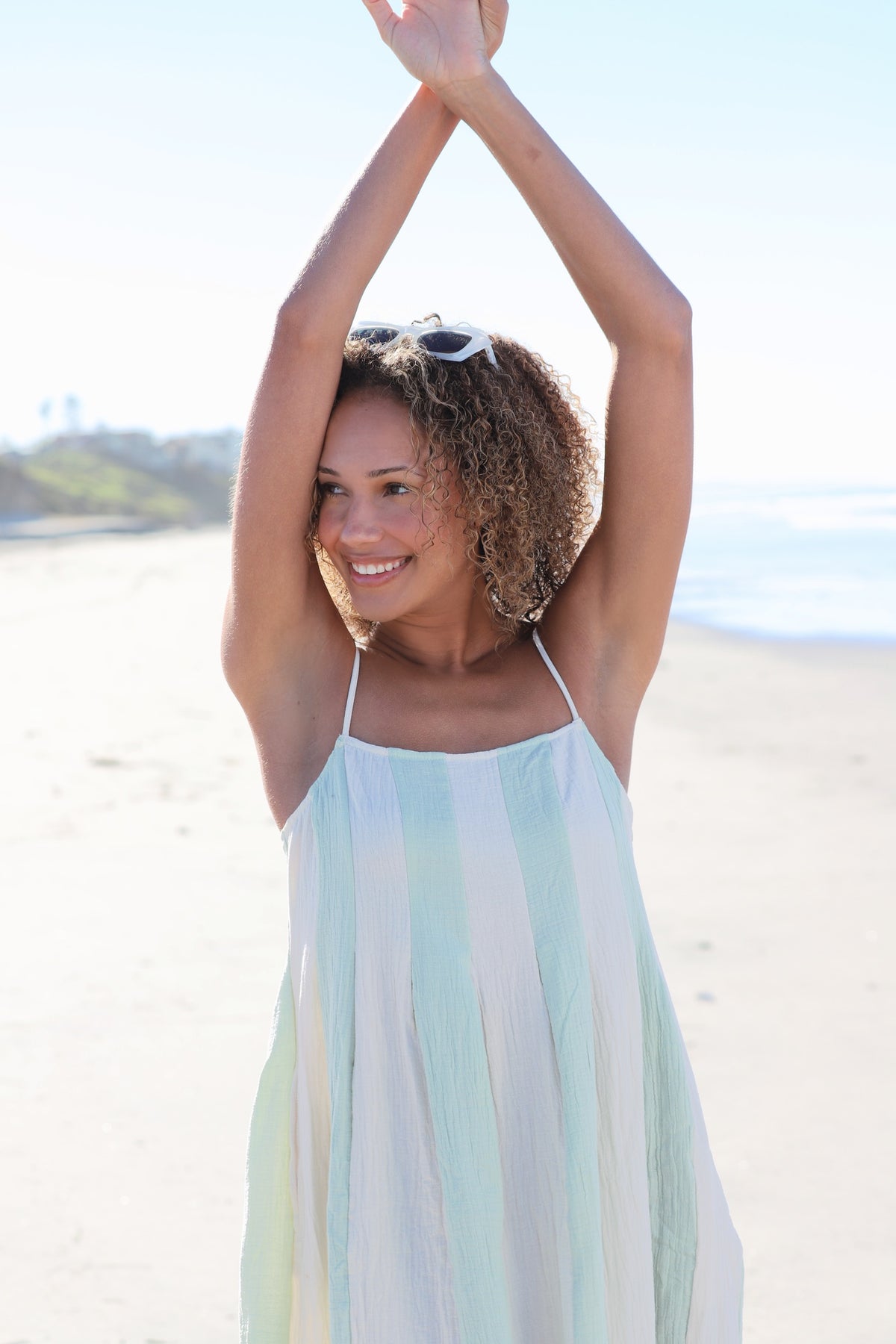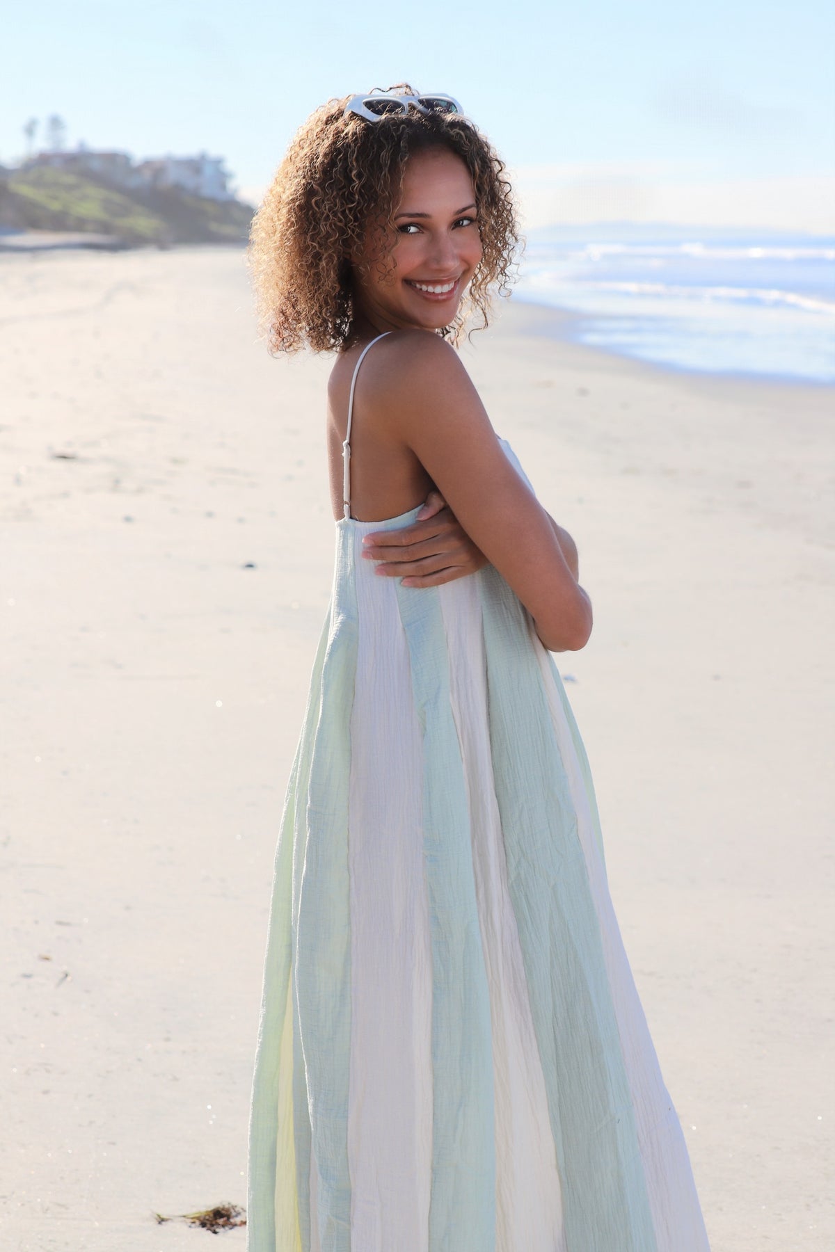 Soft sunrises, ocean breezes, and effortless days—this dress captures it all. The Seaside Morning Maxi features wide pastel blue and cream stripes in a gauzy cotton texture that’s as dreamy as it looks. With a flowy silhouette and barely-there spaghetti straps, it’s the perfect piece for beach strolls, market mornings, or throwing over your bikini.