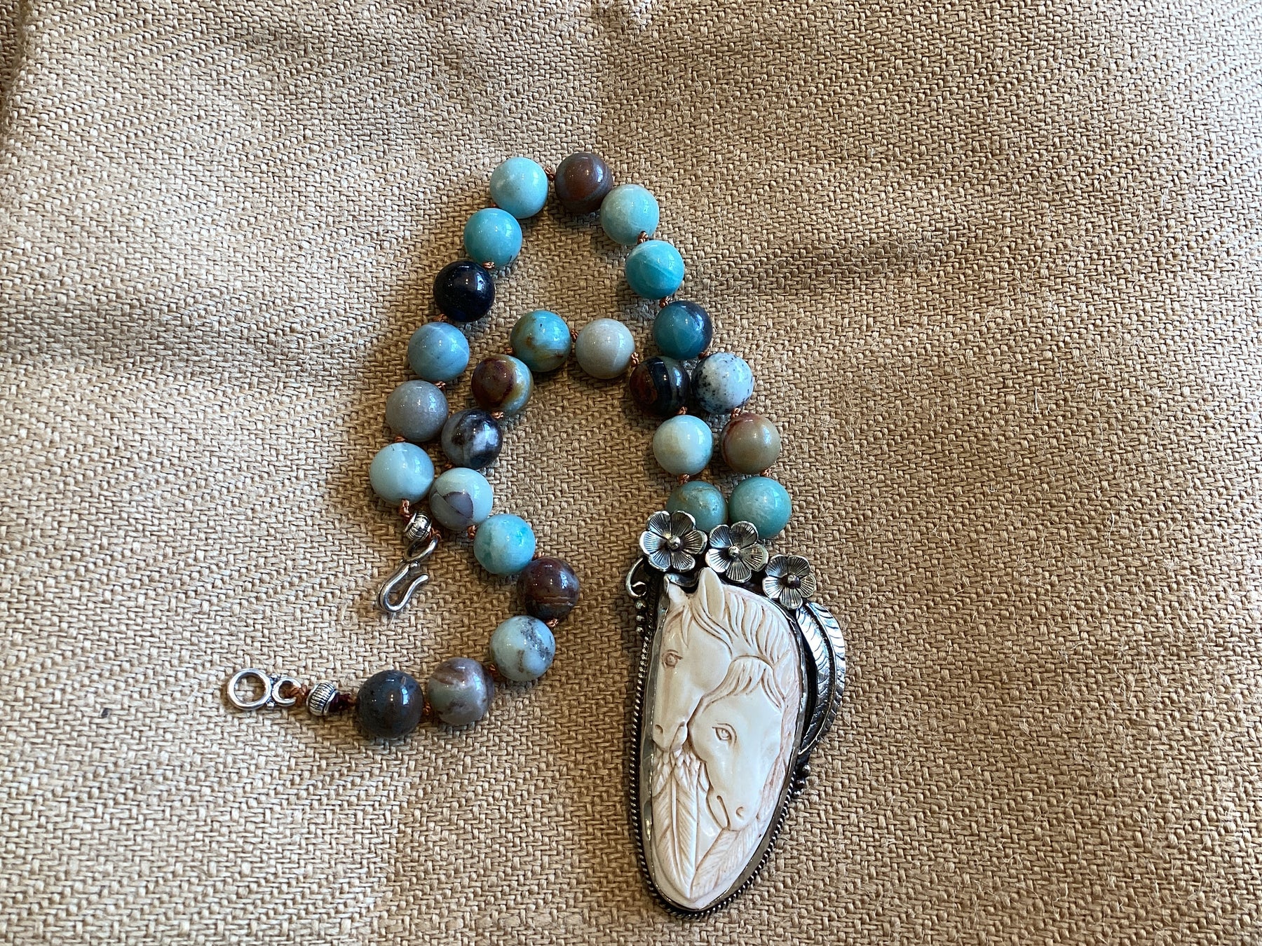 Amazonite gum ball beads with 2 horses pendant. Silk threaded, lay flat to store.