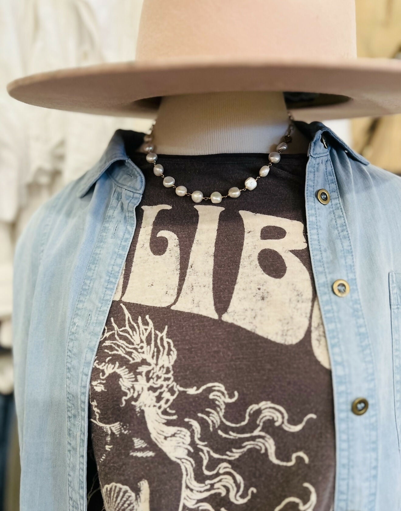 We’re obsessed with how this necklace brings beachy-glam energy to even the most laid-back fits. It’s a must-have layering piece and looks chef’s kiss styled with linen, lace, or low-cut necklines.