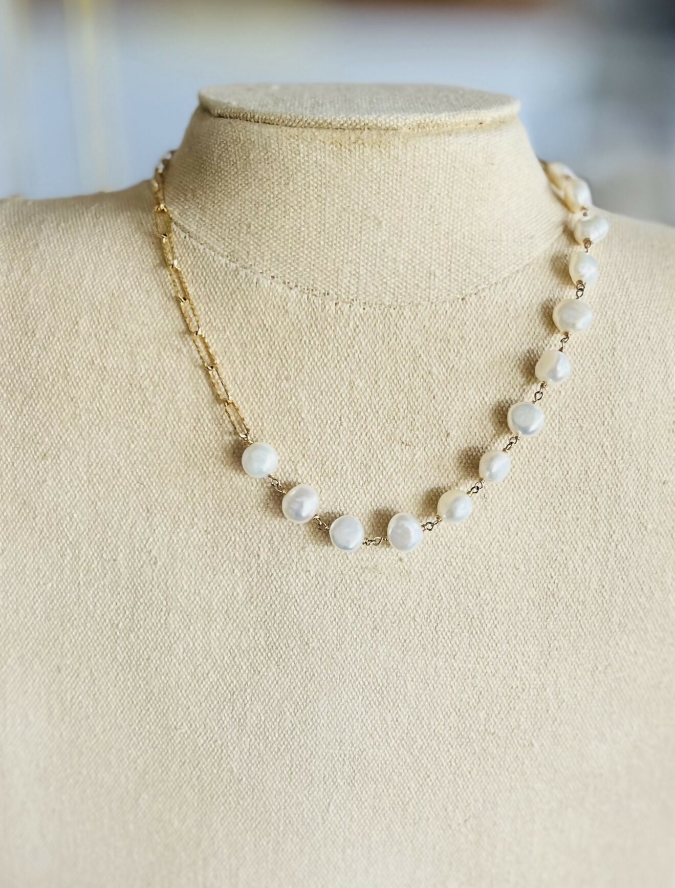 The FWP Necklace is the kind of piece that effortlessly elevates any look—from vintage tees to silky slip dresses. Featuring luminous freshwater pearls and dainty 14k gold-filled thick paperclip chain links, this necklace adds a touch of coastal elegance with just the right amount of drama.