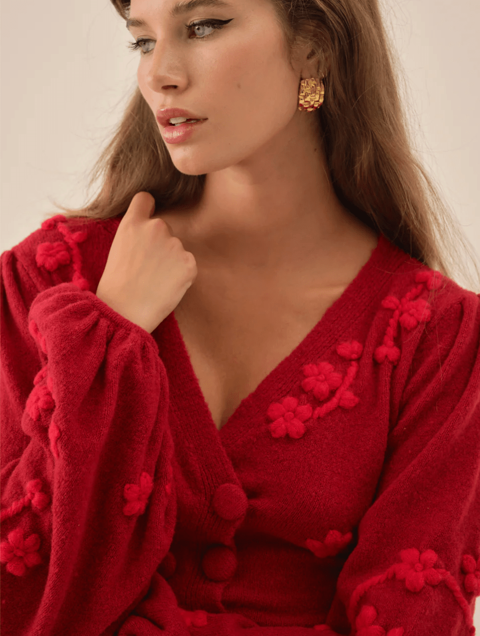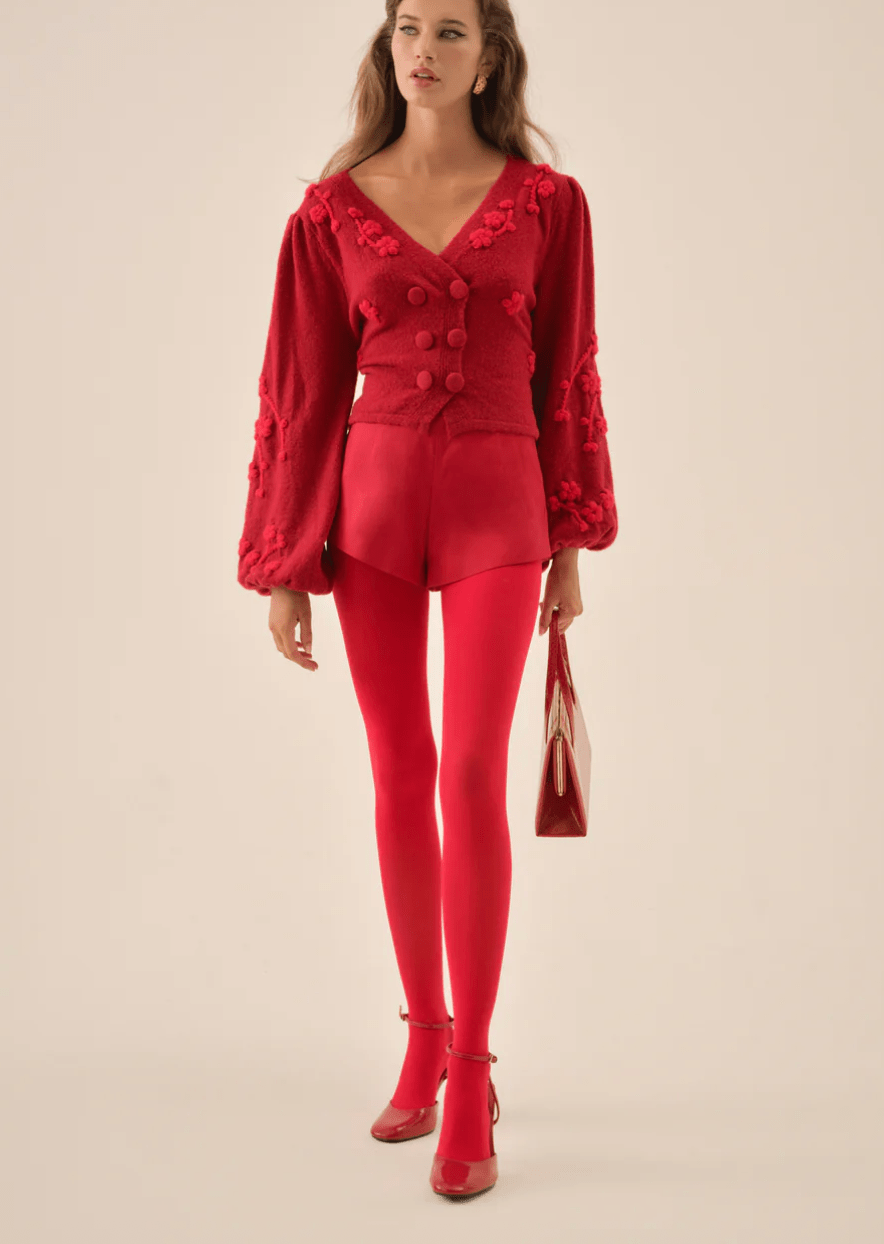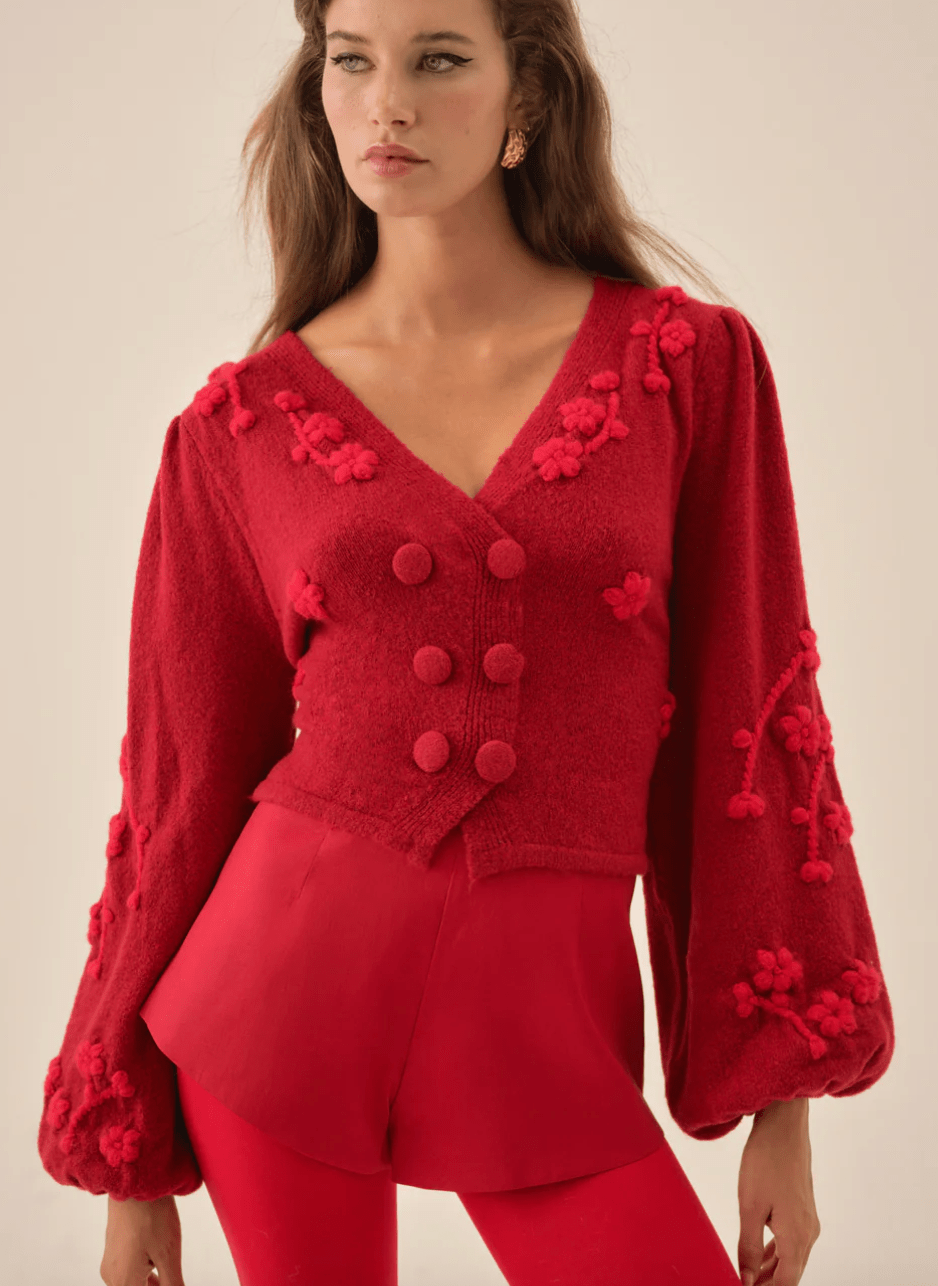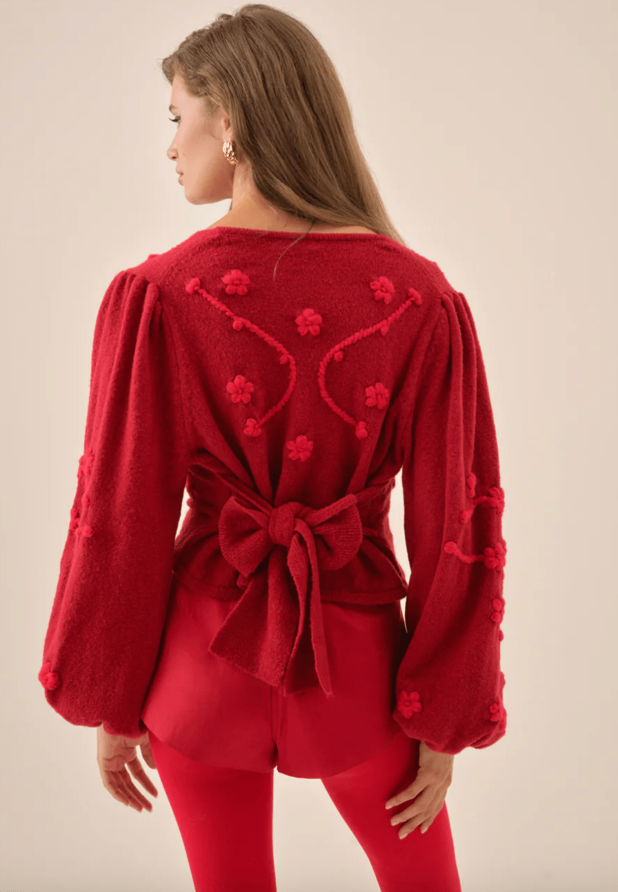 A festive nod to vintage knitwear, the Adalyn red cardigan is crafted with floral embroidery and knit-covered buttons for a touch of nostalgic charm. Designed with long puff sleeves and a waist-defining tie at the back, this double-breasted cardi balances soft femininity with timeless polish.