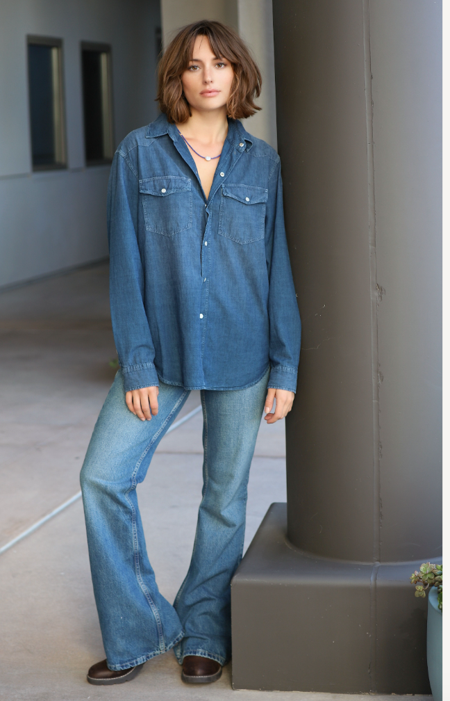 Meet our classic chambray shirt. This slightly oversized style features a relaxed drop shoulder for an effortlessly cool look. The sawtooth yoke and patch pockets showcase timeless denim details, while the AMO logo snaps add an elevated touch.