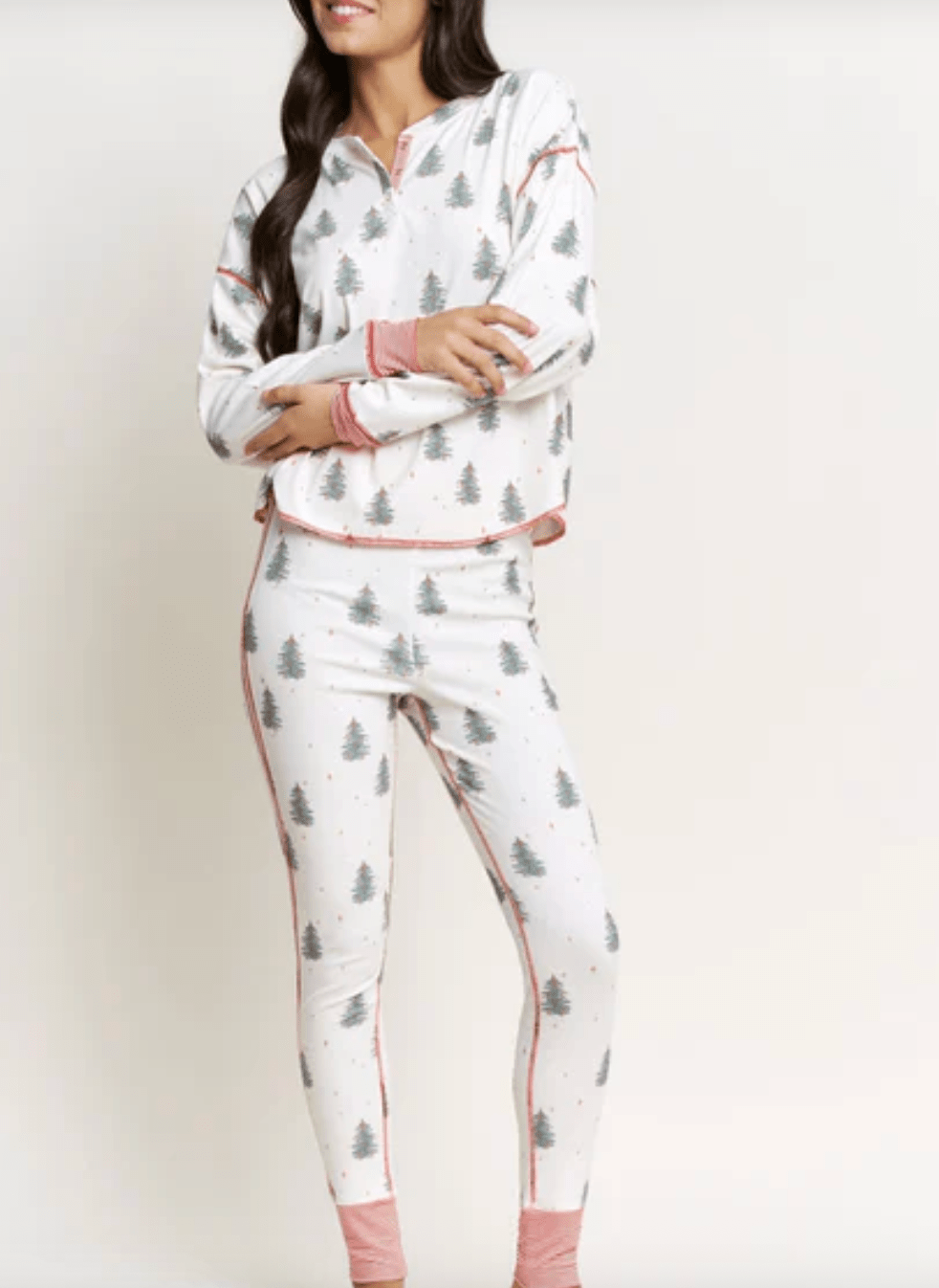 Holiday mornings just got cozier. The Back in Bed Long Sleeve Henley Set brings a playful twist to classic winter loungewear with its dreamy Christmas tree print and comfy thermal-inspired fit. Lightweight, soft, and perfectly stretchy—this is your go-to set for sipping cocoa, gift wrapping, or binge-watching holiday movies from bed.