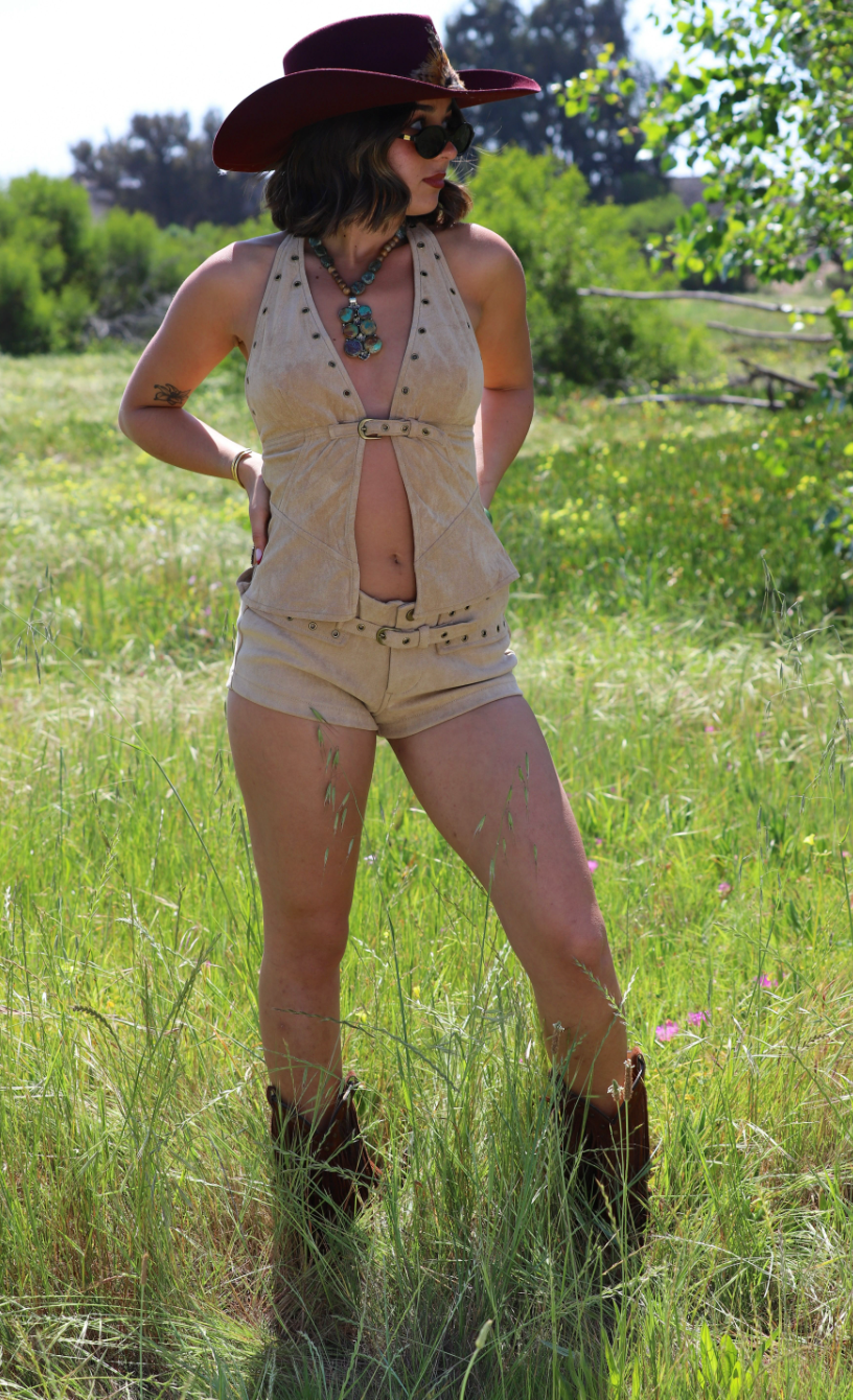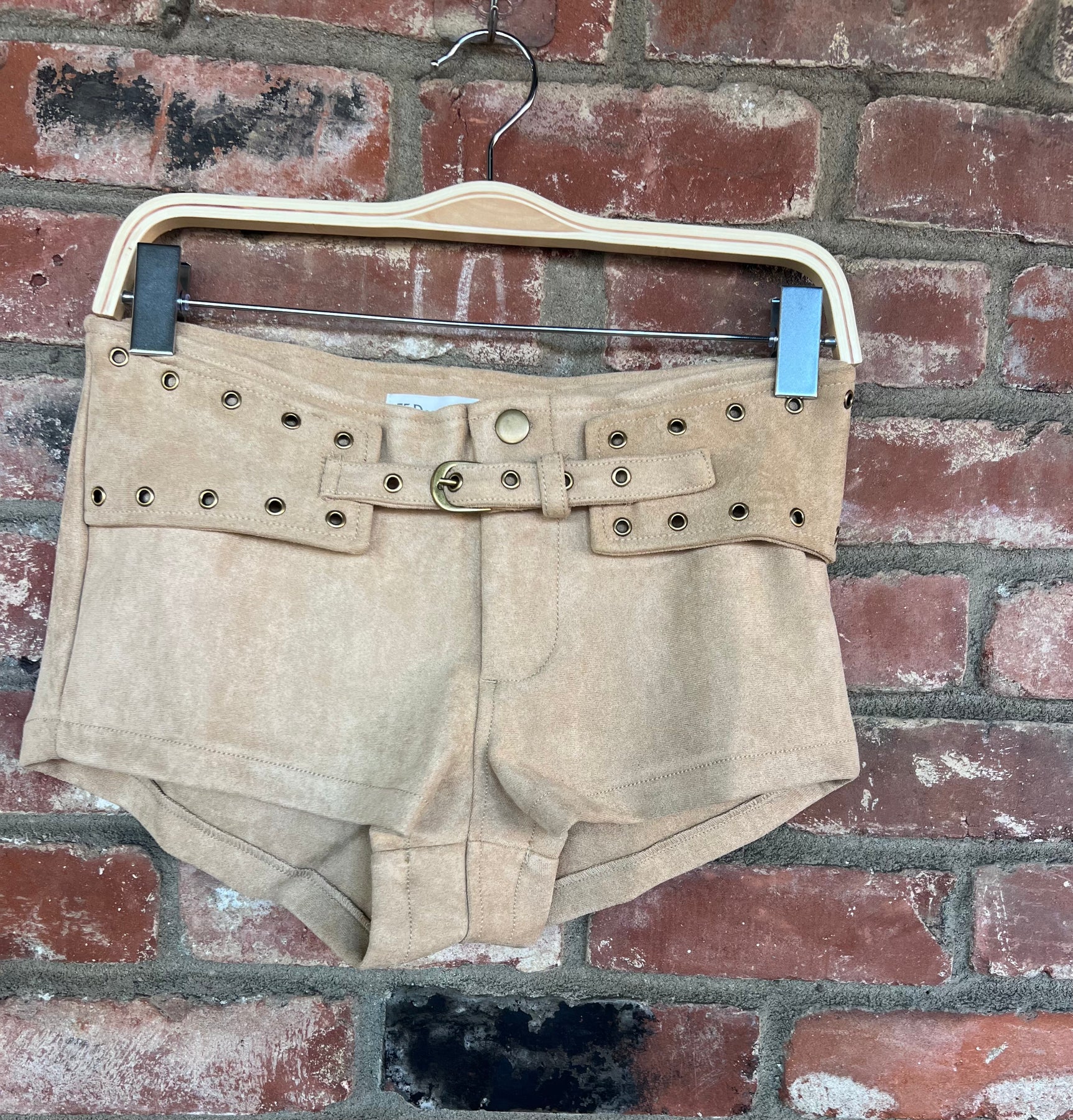 A little western, a little edgy—these tan faux suede shorts bring the perfect mix of texture and attitude. Designed with a low-rise fit and finished with grommet belt detailing, they hug in all the right places while adding a bold, statement touch to your look.