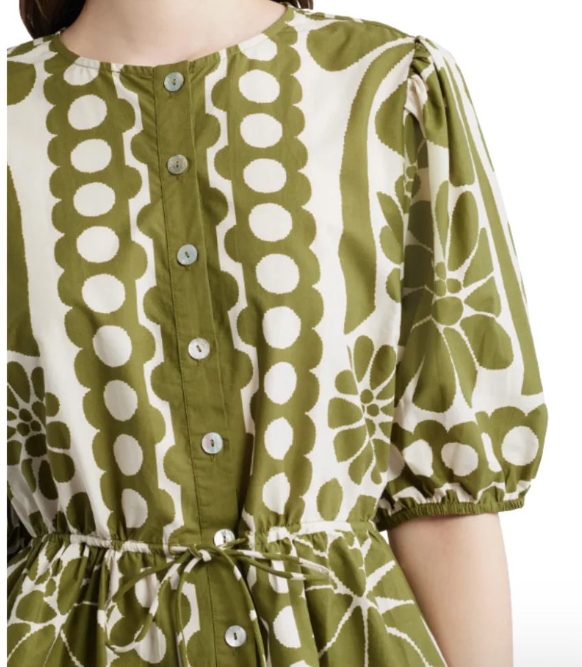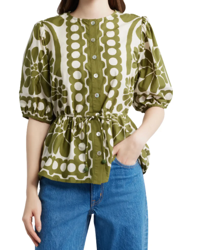 Buoyant puff sleeves frame an all-cotton shirt rendered in a vintage woodblock floral print and cinched with a spaghetti tie at the waist.