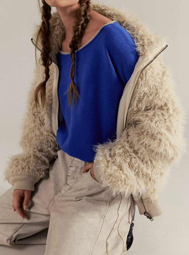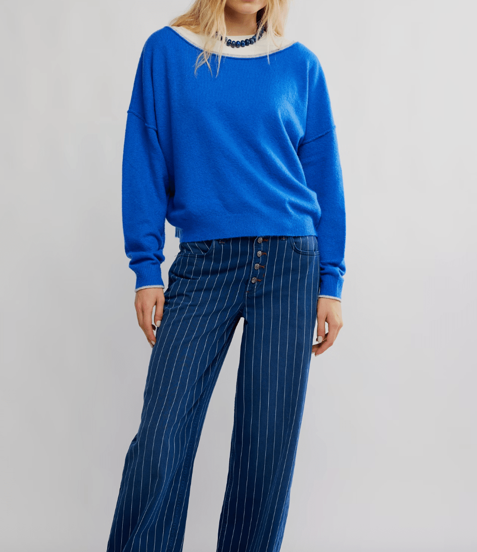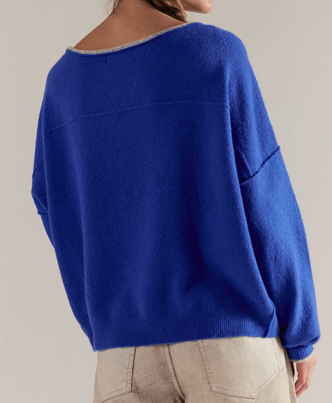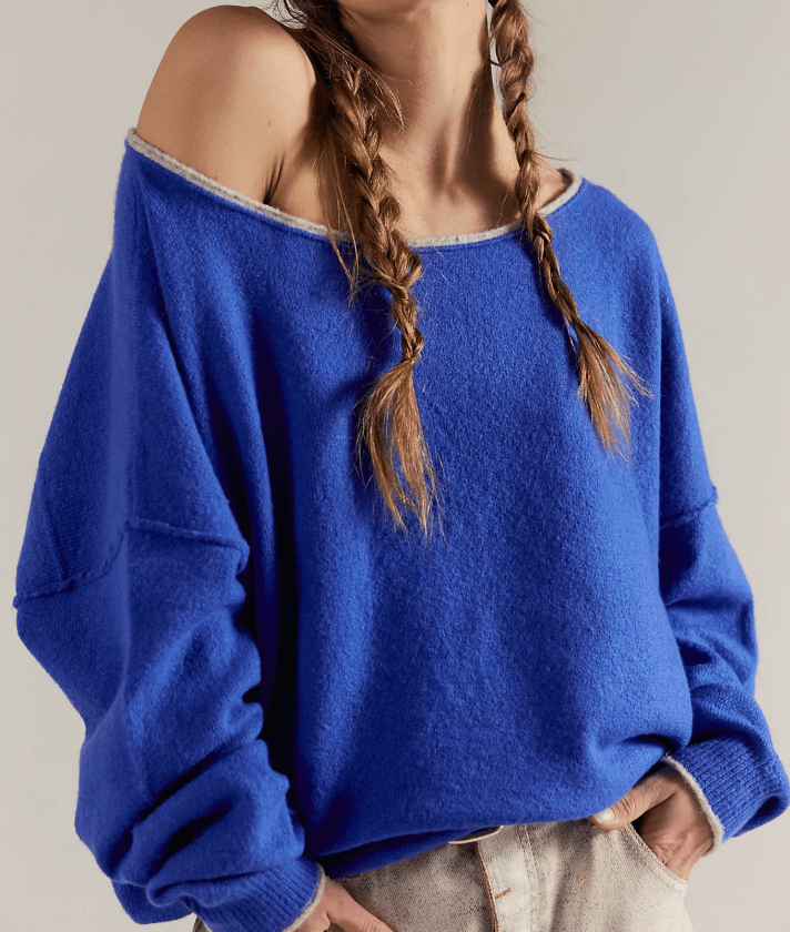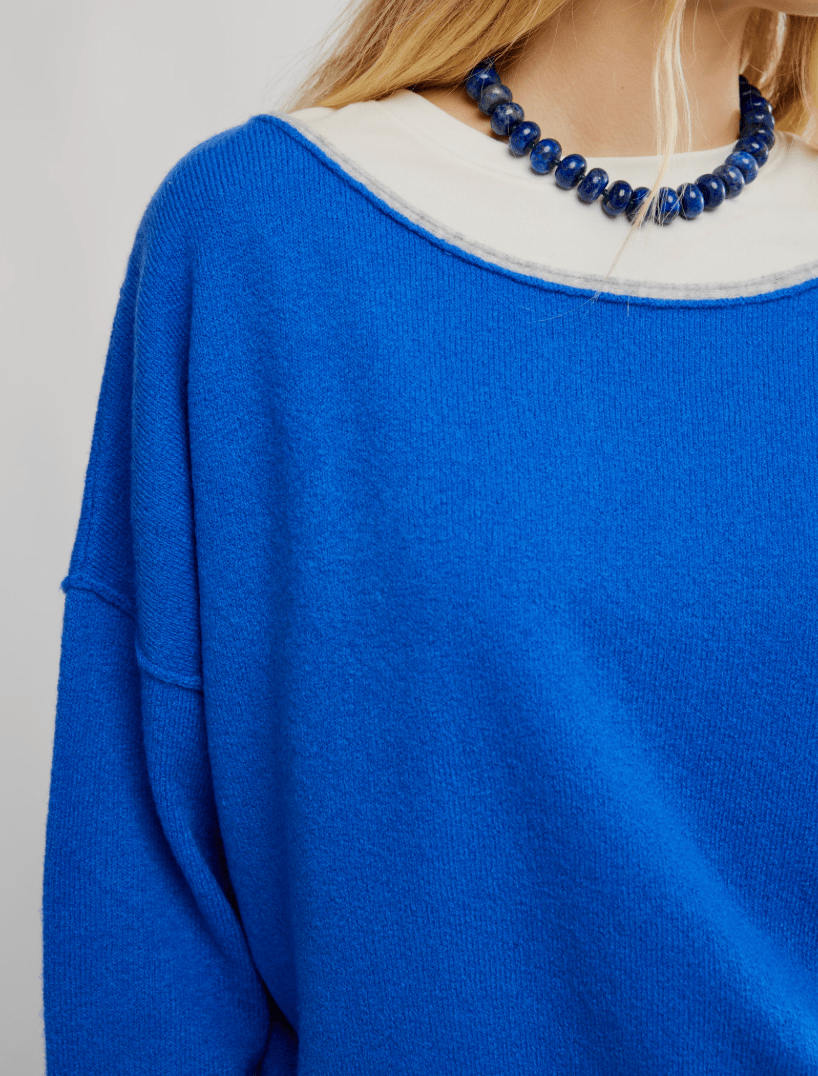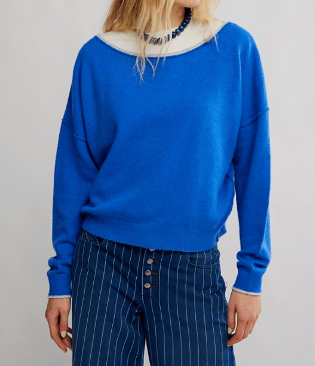 Features: So-soft wool blend, boat neckline, contrasting rolled trims, ribbed hem, drop-shoulder sleeves