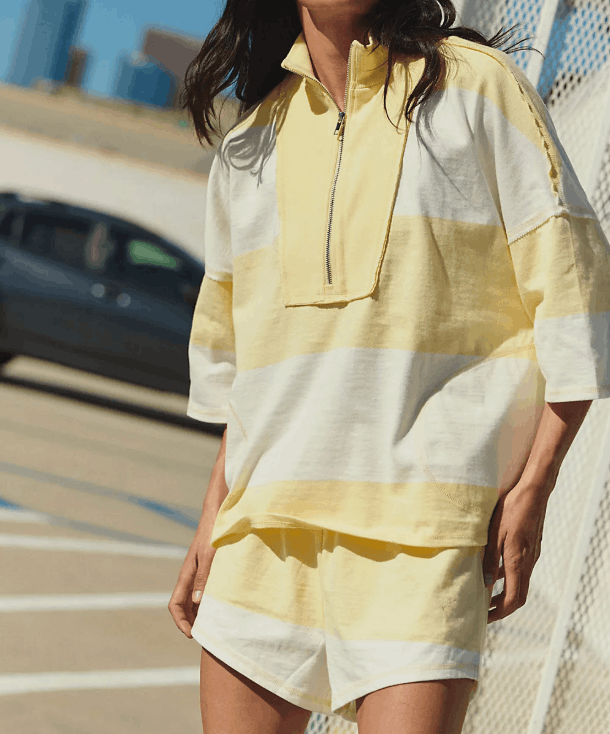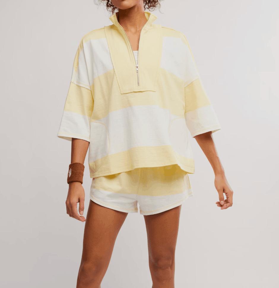 It’s sporty, cool, and just the right kind of oversized. The half-zip gives you styling versatility, while the bold stripes bring all the retro charm we’re loving right now.