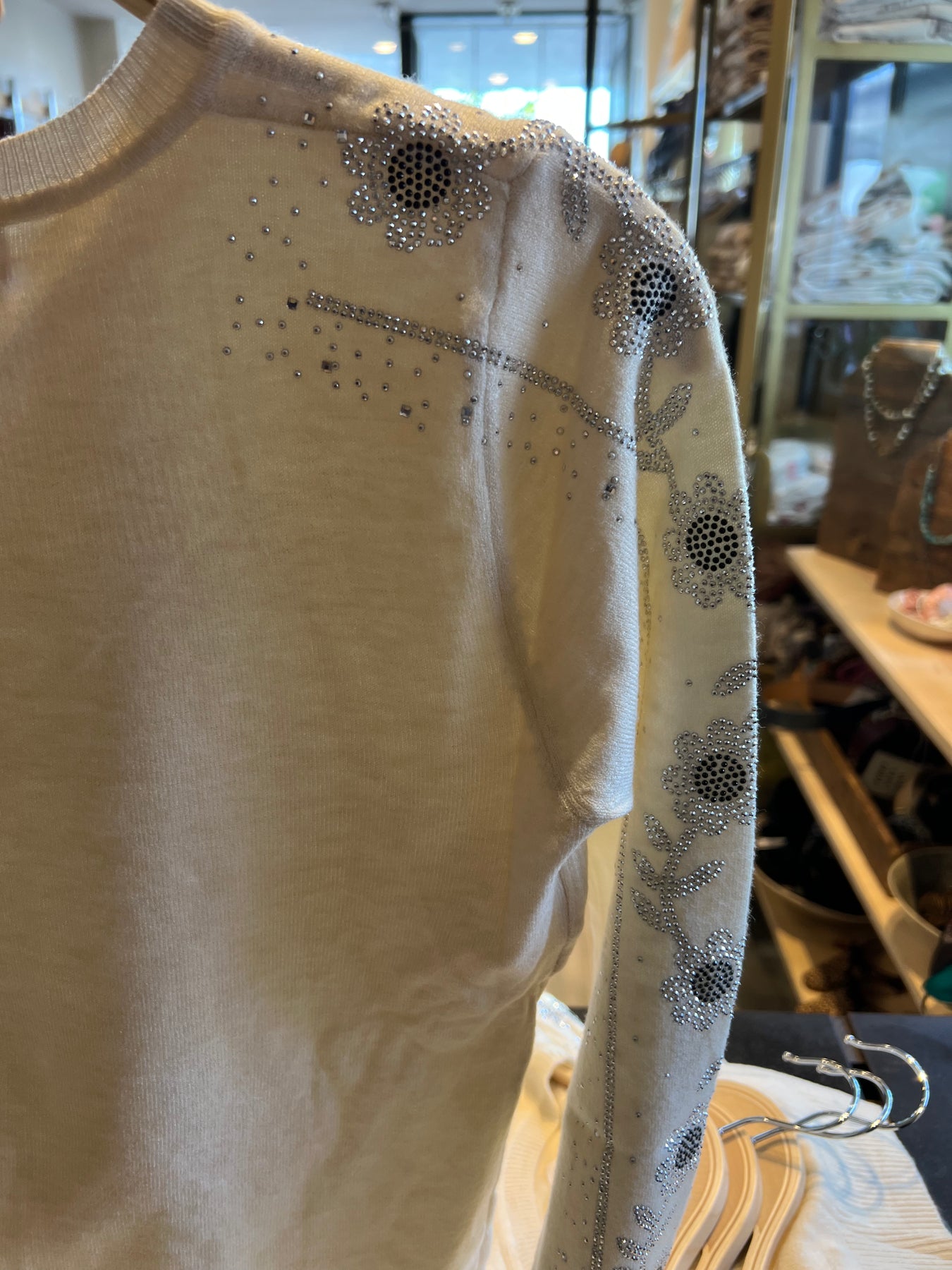 Delicate rhinestone embellishments along sleeves + shoulders