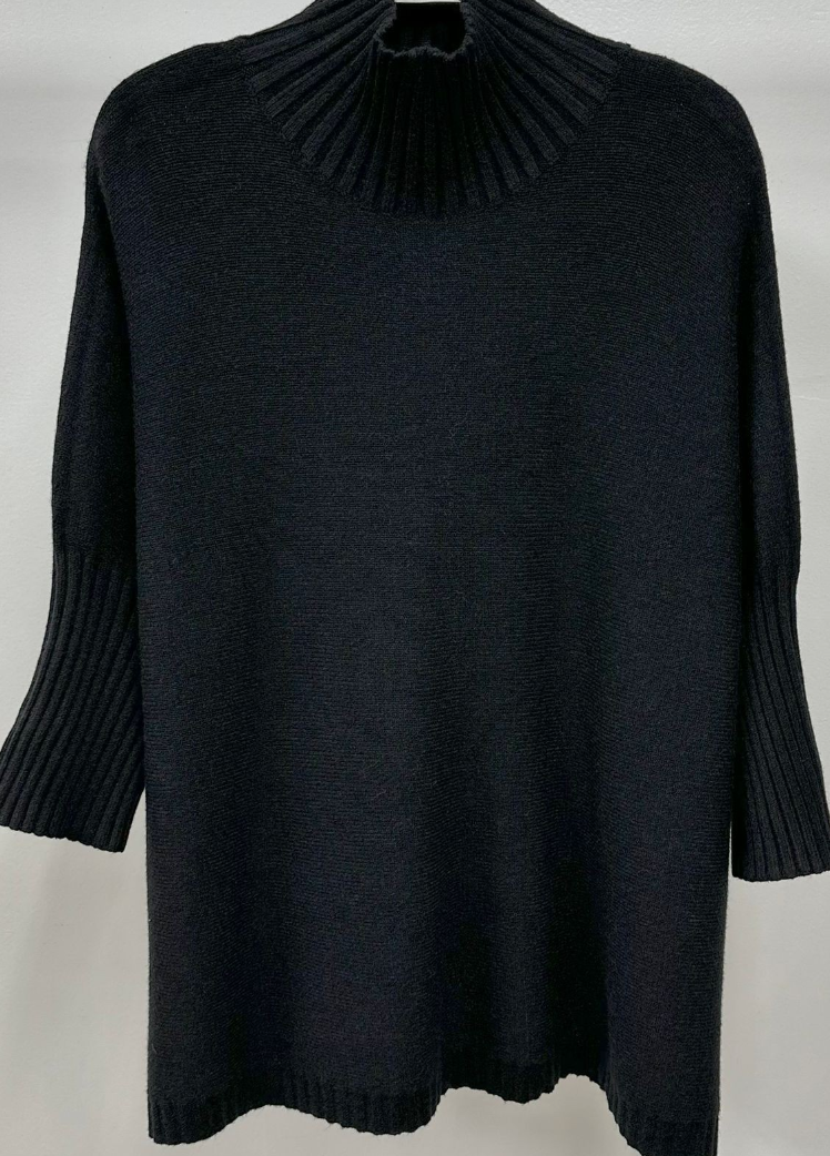 • Style: Mock neck with exaggerated ribbed trim at the neck, cuffs, and hem