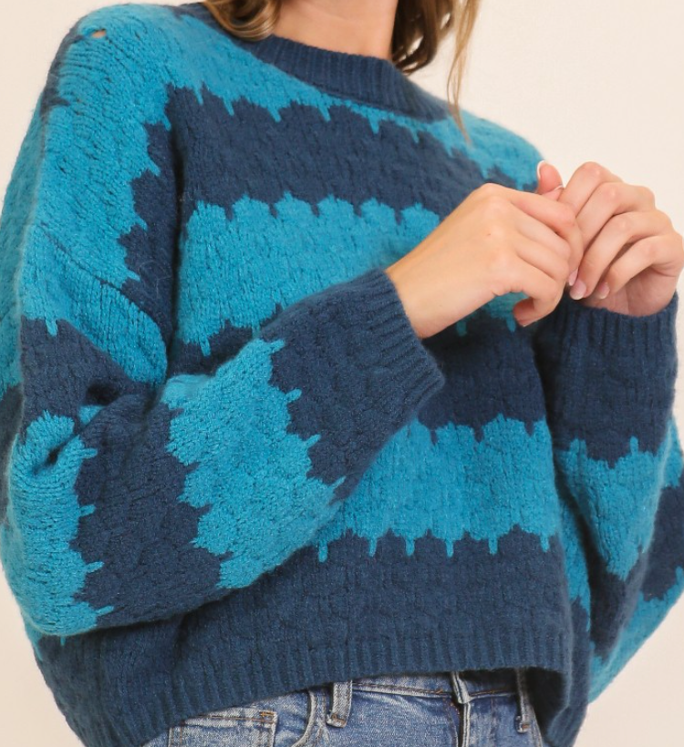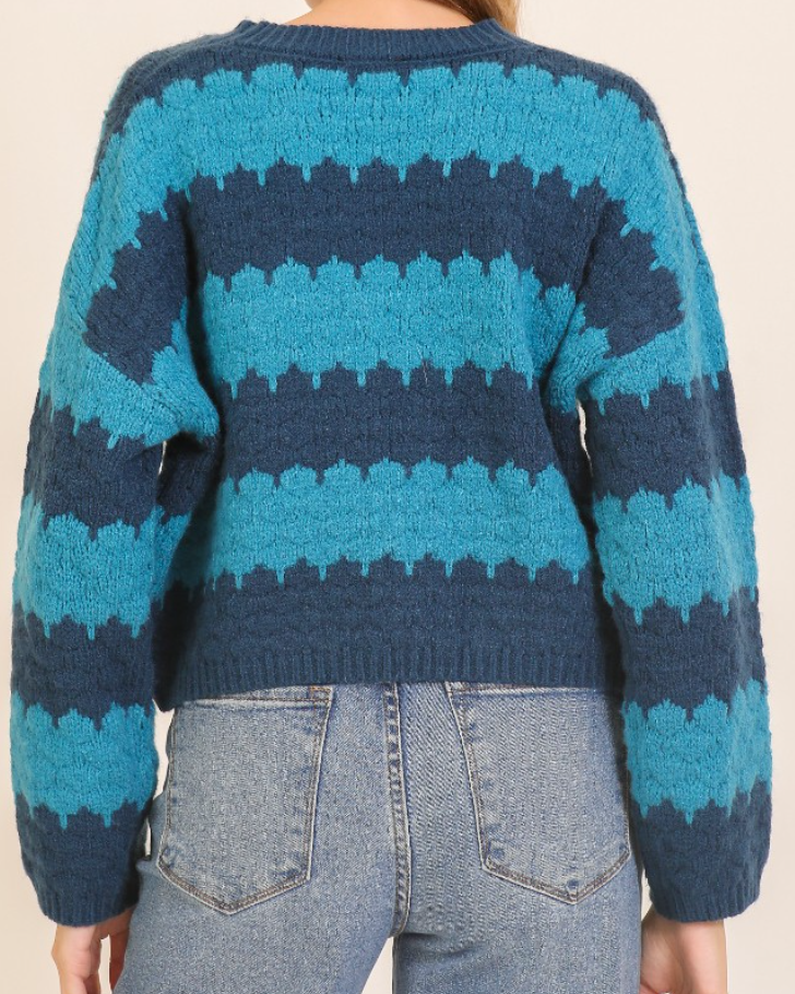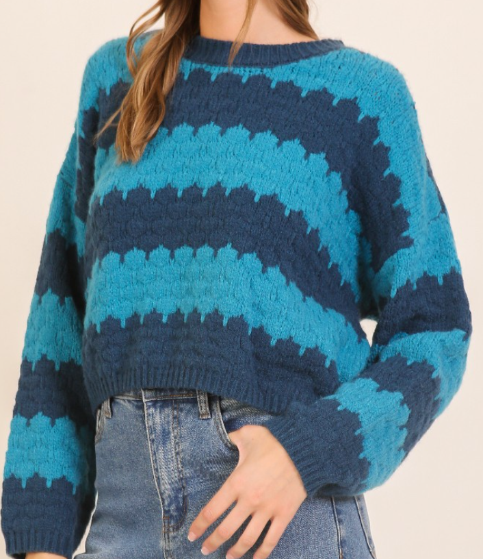 Bold, cozy, and totally SoCal — the Ocean Pop Stripe Knit Sweater is here to brighten your sweater game. With its wave-inspired bold blue stripes and plush texture, this pullover adds a punch of personality while keeping things warm and wearable.
