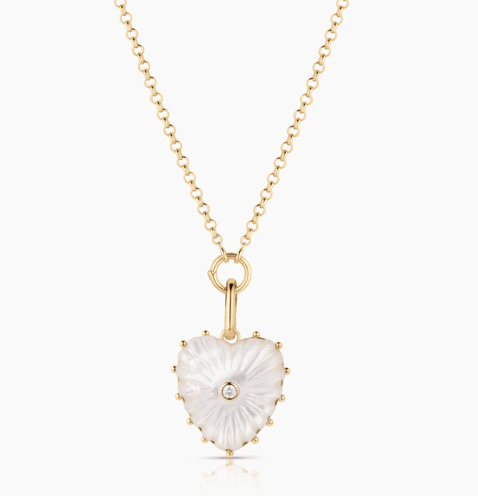 Malene heart charm in luminous mother of pearl hand-carved stone, cubic zirconia, and high-shine gold. Everything you want and need to make a statement.
