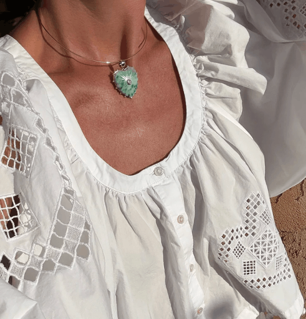 Our Malene heart charm in the unique speckled green dot jasper—hand-carved stone, cubic zirconia, and high-shine gold on a large round bail for versatility. Everything you want and need to make a statement.