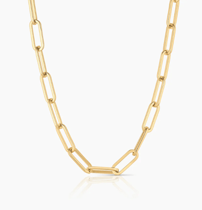 Our signature paperclip necklace gone XL. This bold piece can be worn with your finest tailored suits or mixed in with your favorite delicate chains for an instant cool girl neck mess. A must-have for every jewelry box.