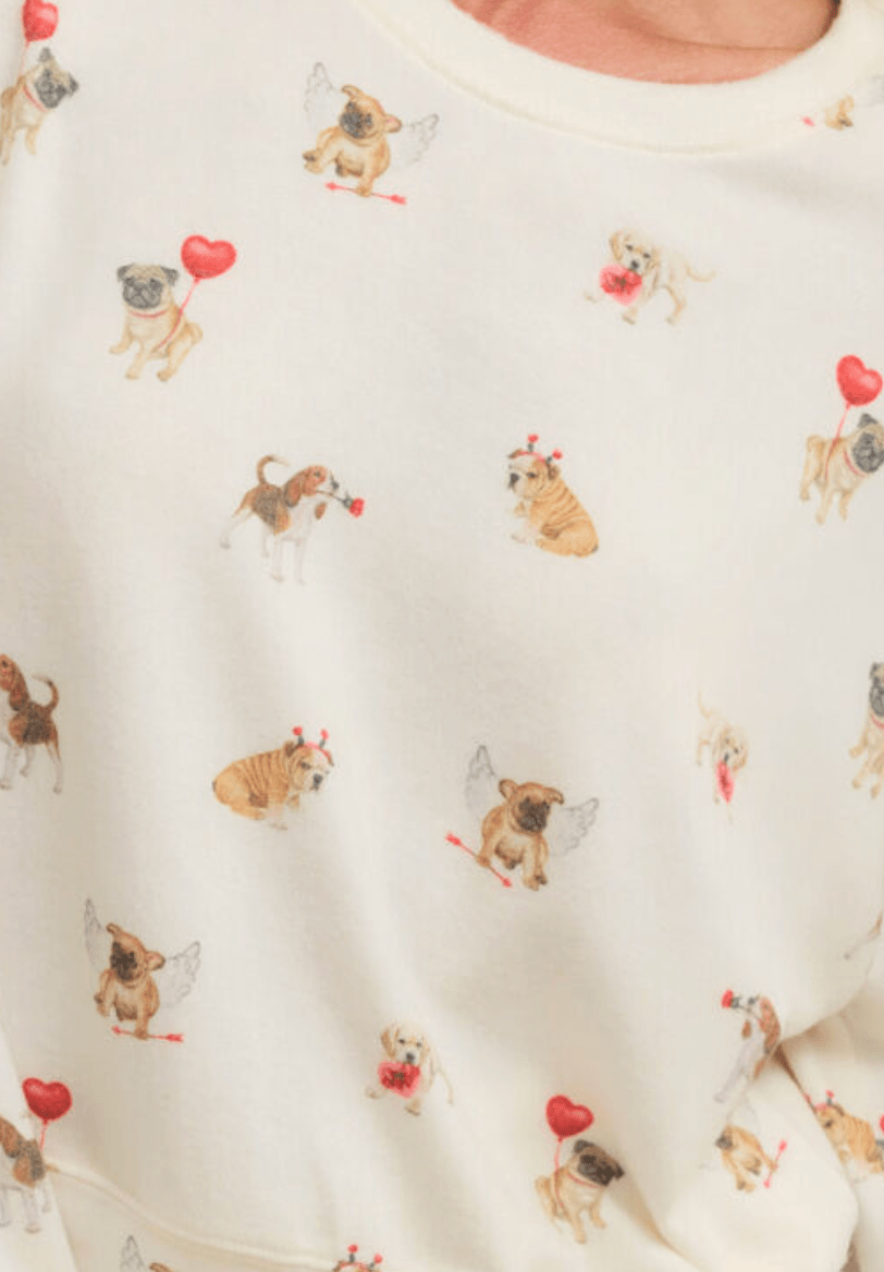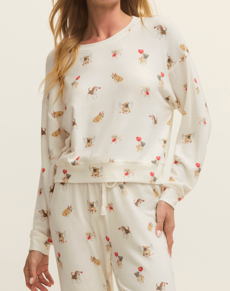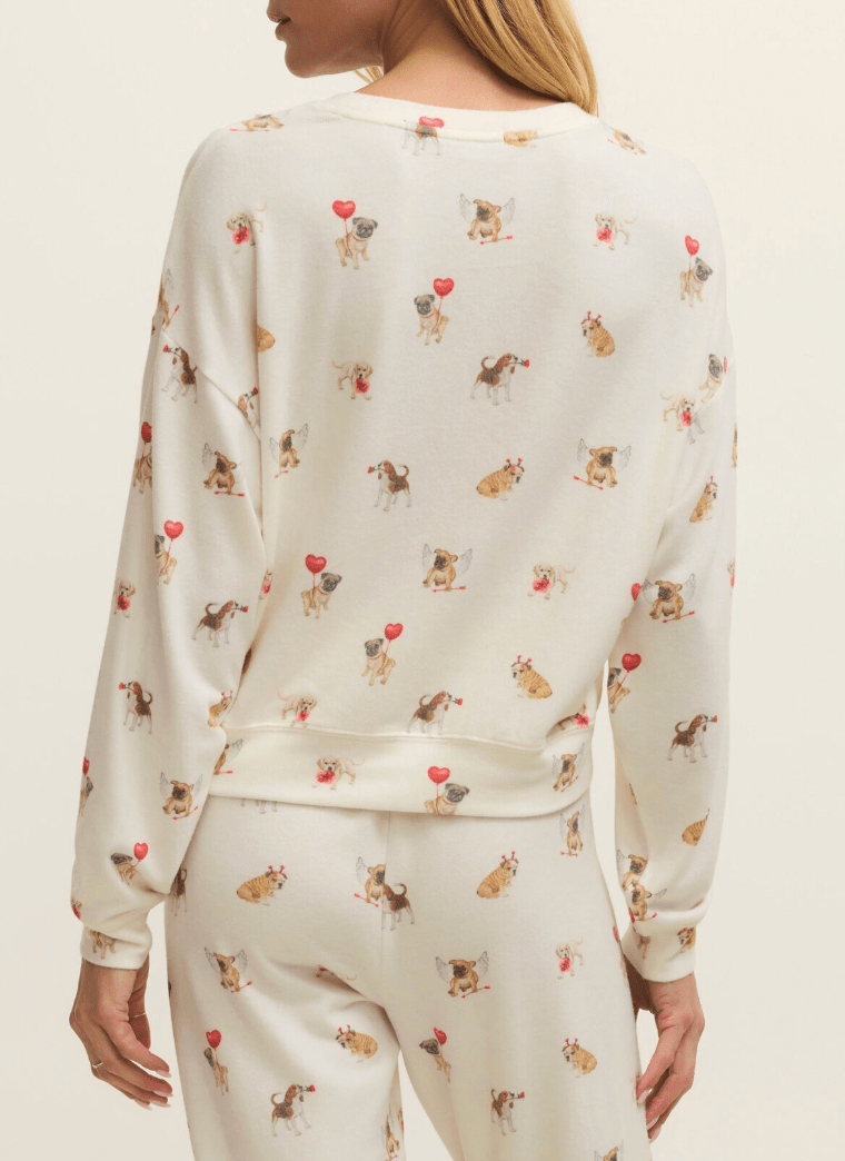 Fall head over heels for the Bisous Love Pup Top by Z Supply—your new go-to for cozy nights in and cute mornings with coffee. This ultra-soft pullover features an all-over Valentine pup print (yes, dogs with wings, heart balloons, and flower crowns!) on a creamy vanilla backdrop. With its relaxed fit and soft brushed knit fabric, this sweatshirt brings max comfort and playful charm.
