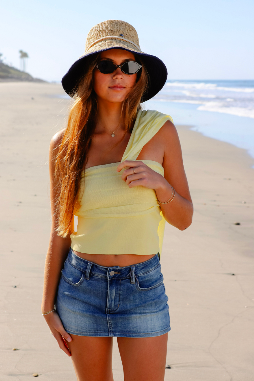 Pair it with high-waisted denim, tailored trousers, or a mini skirt for a fresh, head-turning outfit that feels both modern and fun. This set is your go-to for making a bold, sunny statement.