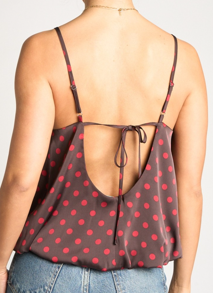 Playful with a flirty twist, the Sunset Dots Balloon Cami brings retro charm into the now. With its silky satin finish, bold red polka dots, and statement balloon hem, this cami is perfect for breezy days and balmy nights. The low back with a delicate tie adds a little drama, while adjustable straps make it easy to find your perfect fit.