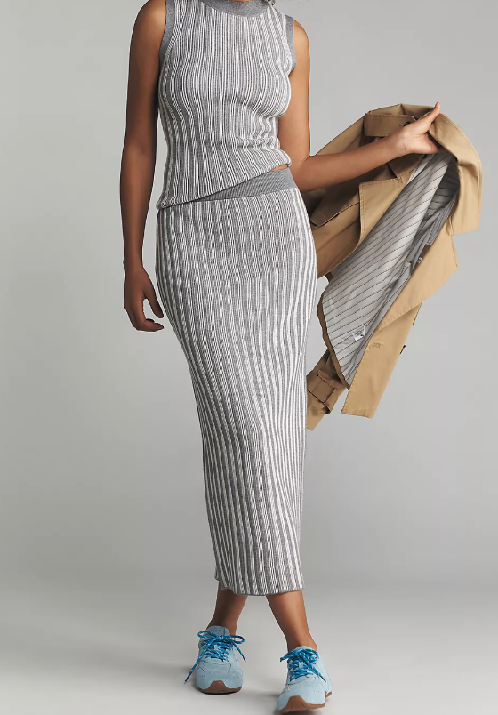 The Mairead Rib Knit Skirt by Varley is the definition of polished ease. Designed in a soft, stretchy rib knit, this midi silhouette skims the body in all the right places, with a subtle side slit for just the right amount of movement. The Silver Filigree color—a versatile blend of soft grey and ivory—makes it a timeless piece you’ll reach for season after season.