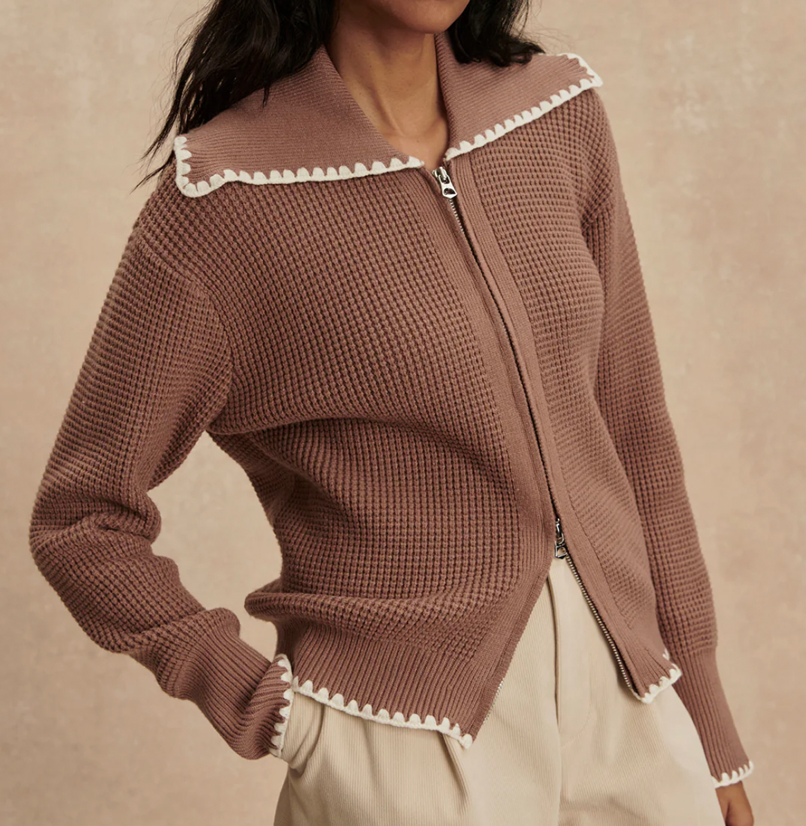 Its waffle stitch design and scalloped edging offer elevated style, while the standard fit ensures a flattering silhouette. With a signature oversized collar and double-ended zip, this jacket is perfect for pairing with tailored trousers or adding a chic layer to any outfit.