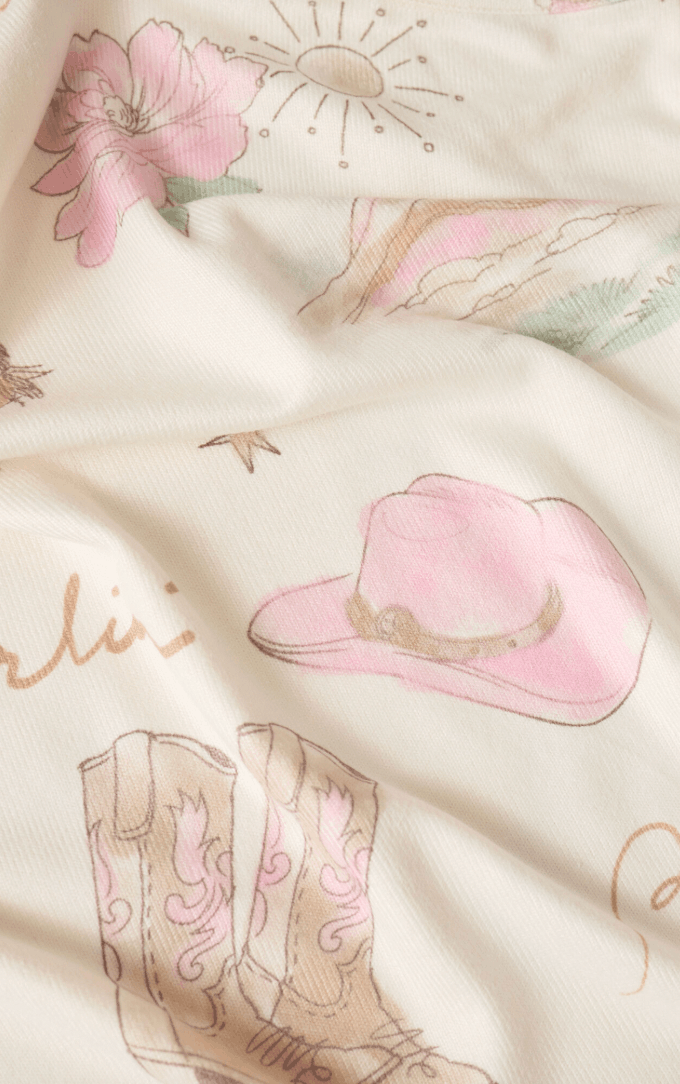 Cowgirl dreams meet cozy loungewear in the Dawn Desert Rose Long Sleeve Top by Z Supply. Designed in the softest brushed jersey, this relaxed-fit pullover brings all the western charm with an illustrated desert print featuring pink cowgirl hats, boots, bucking broncos, sunsets, and sweet little “Howdy” details throughout. It’s a playful nod to desert daze with a soft-as-a-cloud feel you’ll never want to take off.