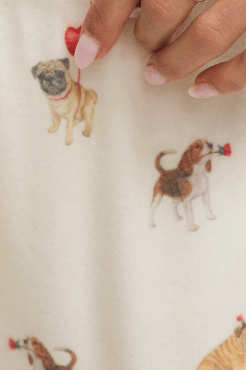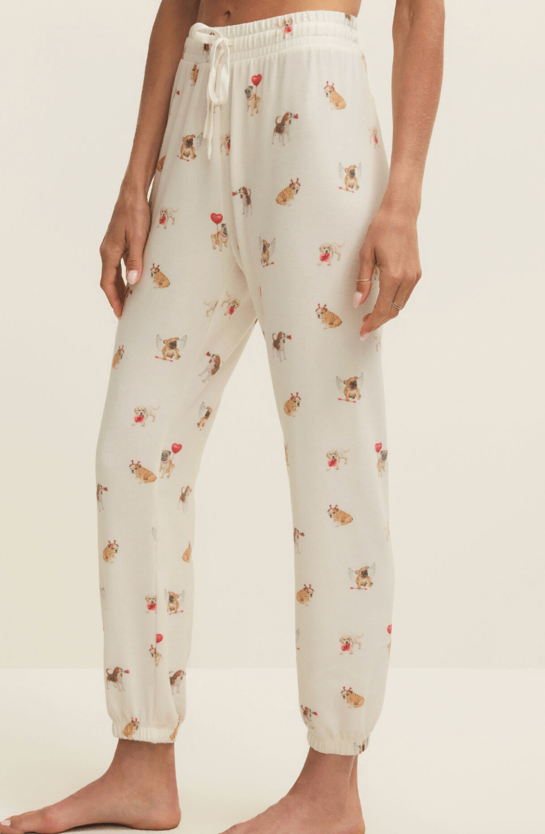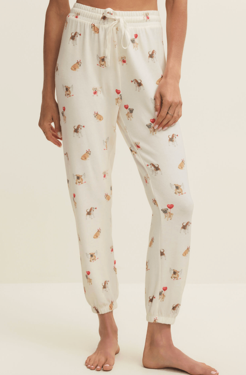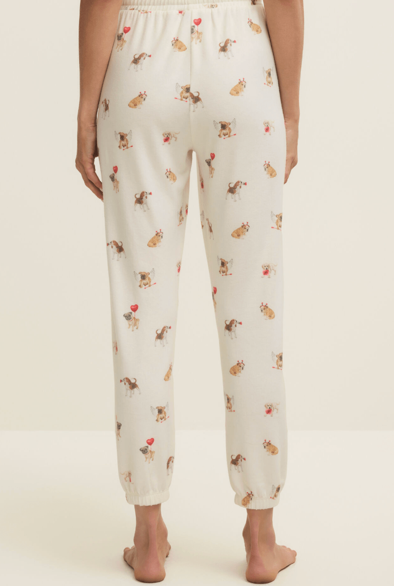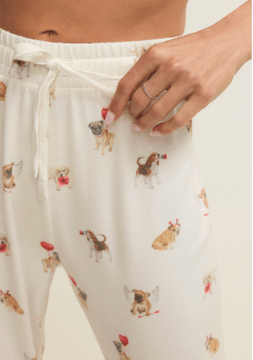 Cozy up with the cutest crew of canines in the Overnight Love Pup Jogger by Z Supply. Made from ultra-soft brushed knit, these relaxed jogger-style PJ bottoms feature the sweetest assortment of playful pups decked out in Valentine’s Day flair—think heart balloons, cupid wings, and more. Whether you're lounging, movie-marathoning, or grabbing that first cup of coffee, these pups have your back (and legs).