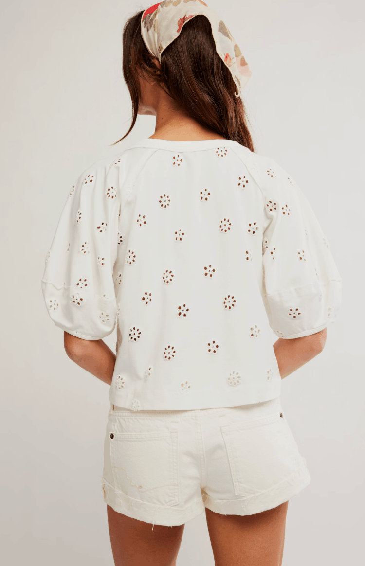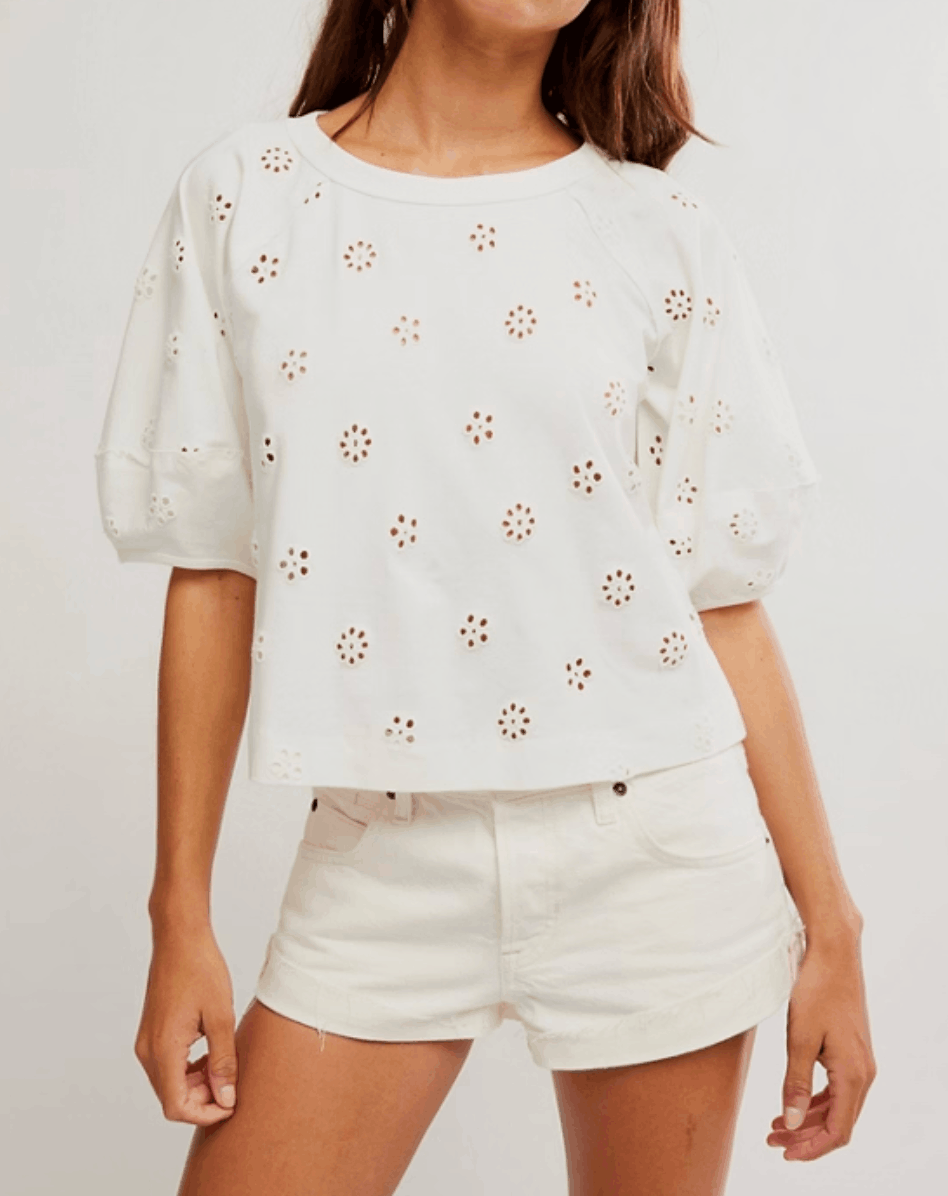 Style Details: Eyelet floral embroidery, bubble sleeves, ribbed neckline and hem