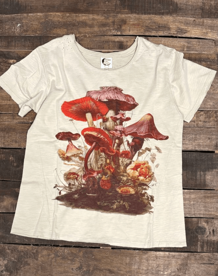Whimsy meets wanderlust in the Moon Dance Tee—a soft and soulful graphic tee that feels like a page out of a fairytale. Featuring a magical cluster of mushrooms, wild blooms, and earthy reds, it’s made for moonlit strolls, garden daydreams, and slow mornings with coffee in hand. The gently distressed detailing around the neckline gives it that perfectly vintage, well-loved vibe.